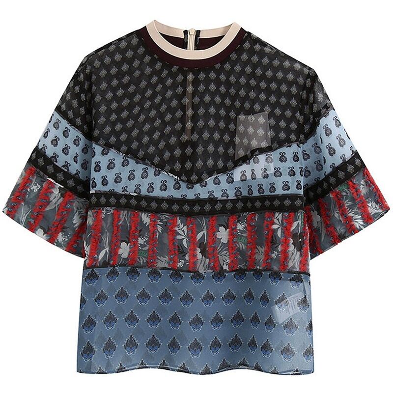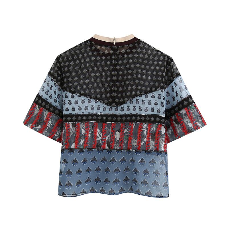 エスニック シアー ラウンドネック 半袖 シャツ ブラウス *bl284