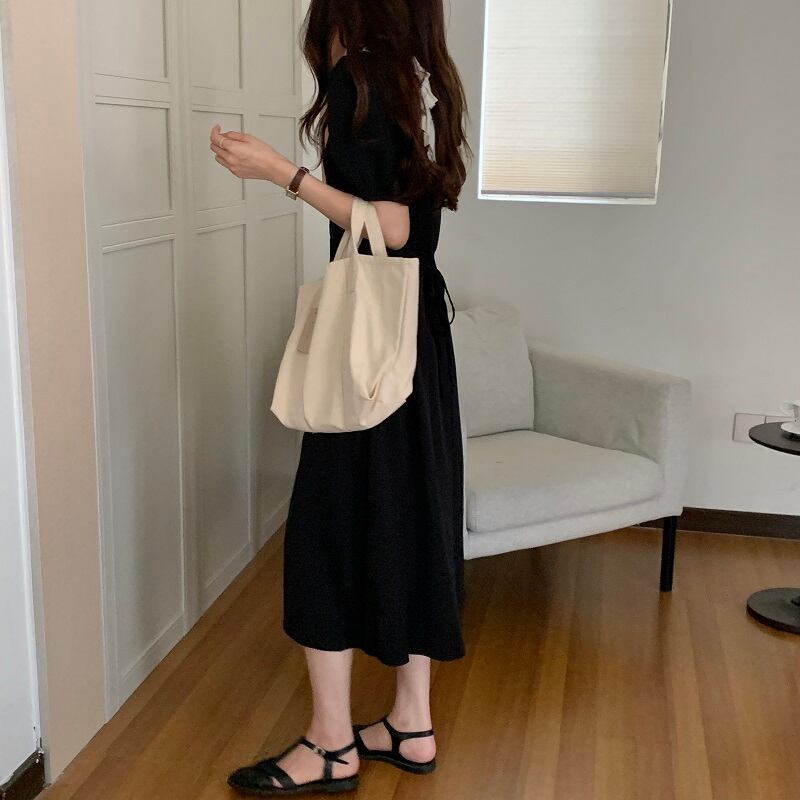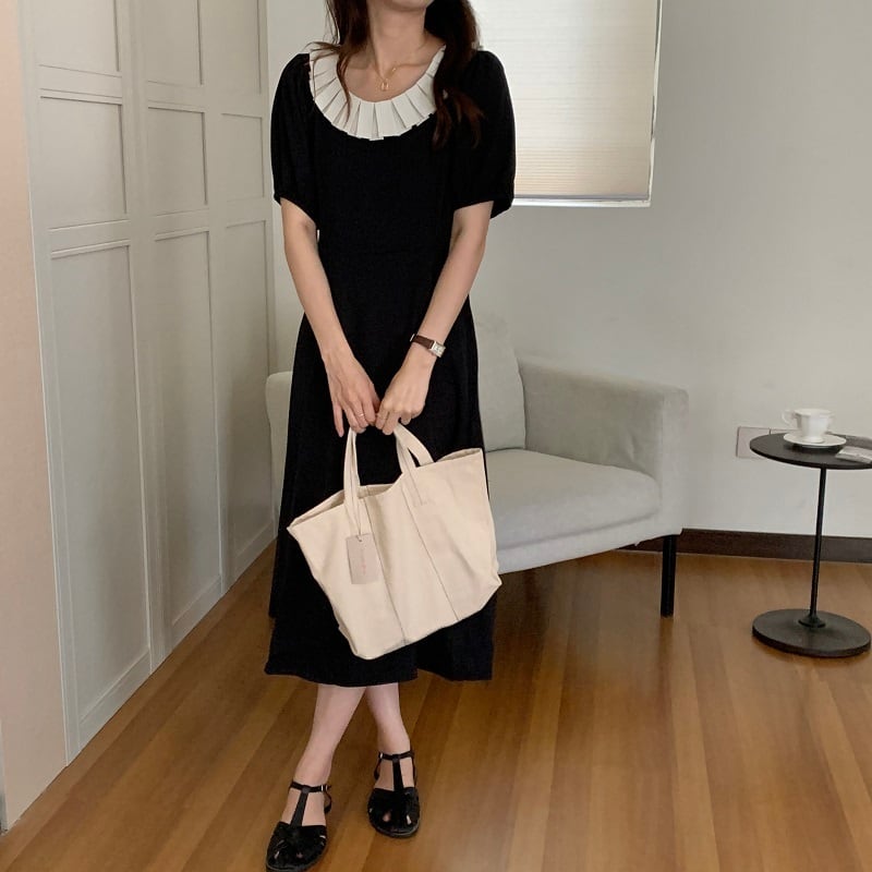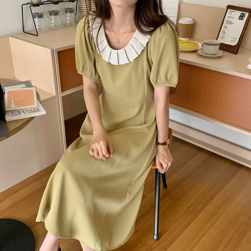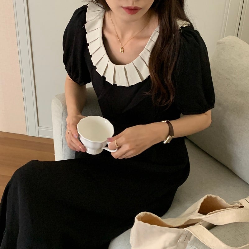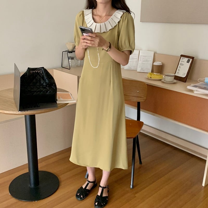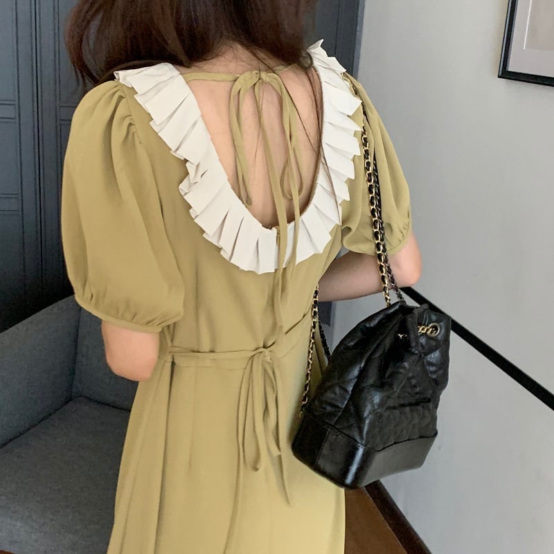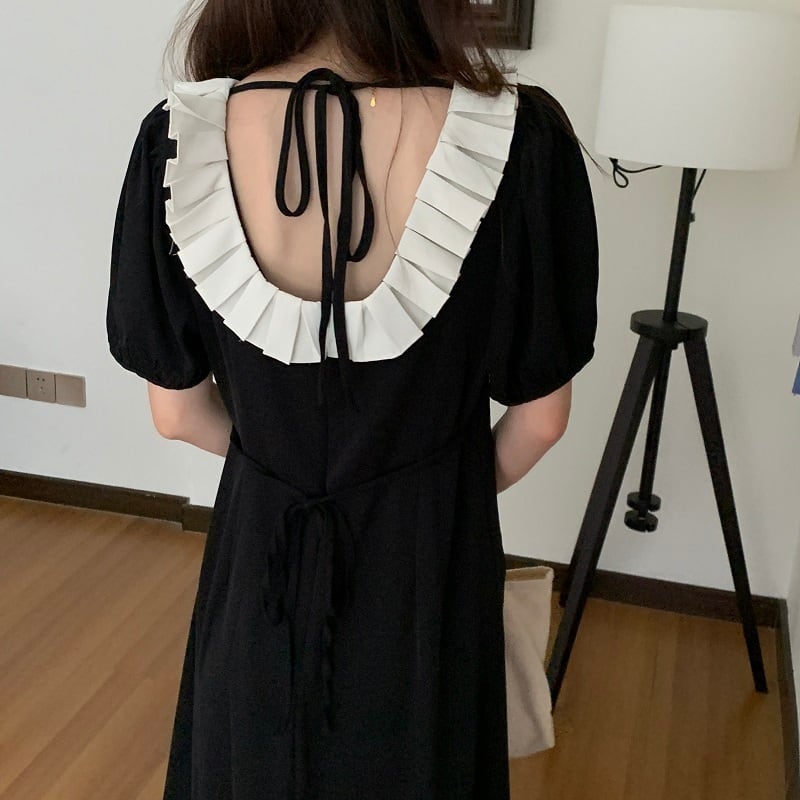 2カラー プリーツ襟 バックリボン ラウンドネック 半袖 ワンピース *on602