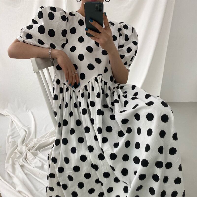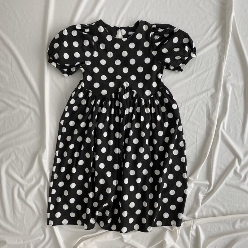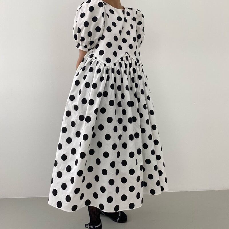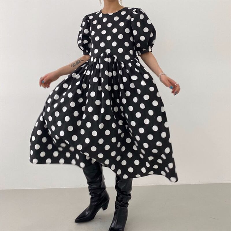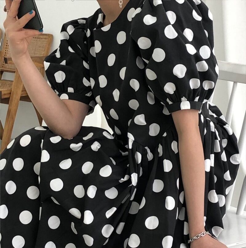 2カラー 水玉柄 パフスリーブ バックオープン 半袖 ワンピース *on604