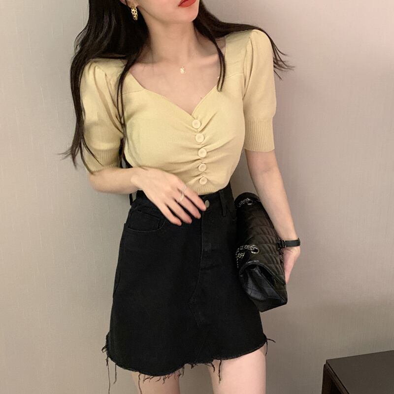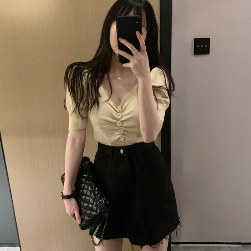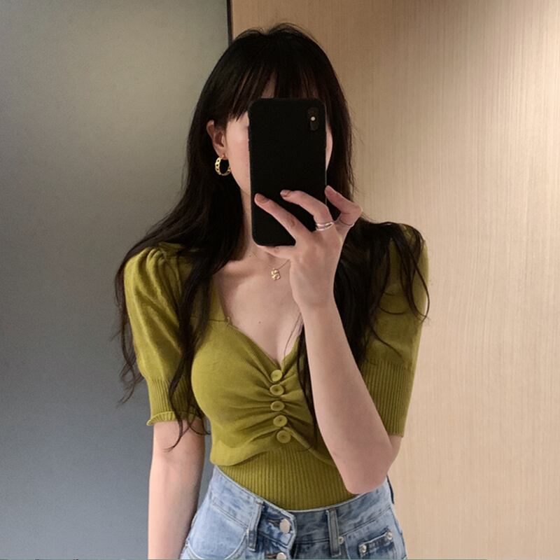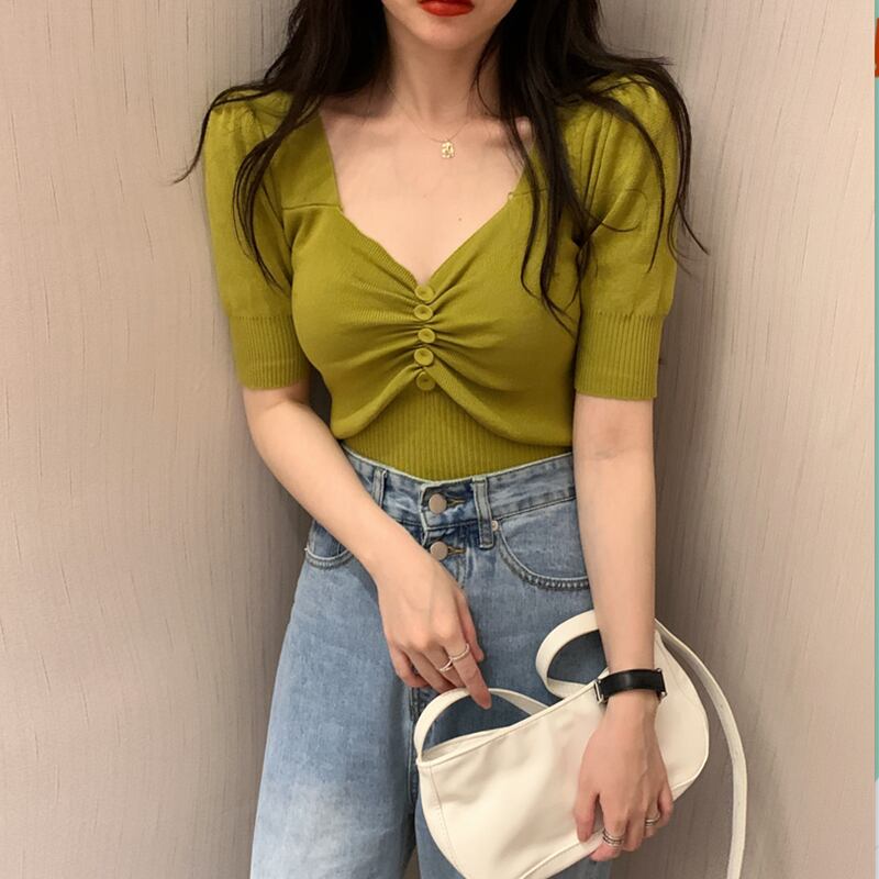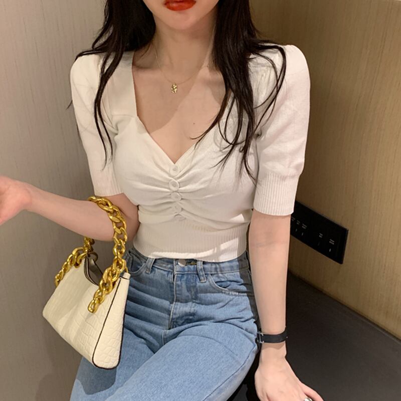 7カラー ボタン ギャザー Vネック シャツ ブラウス *bl288