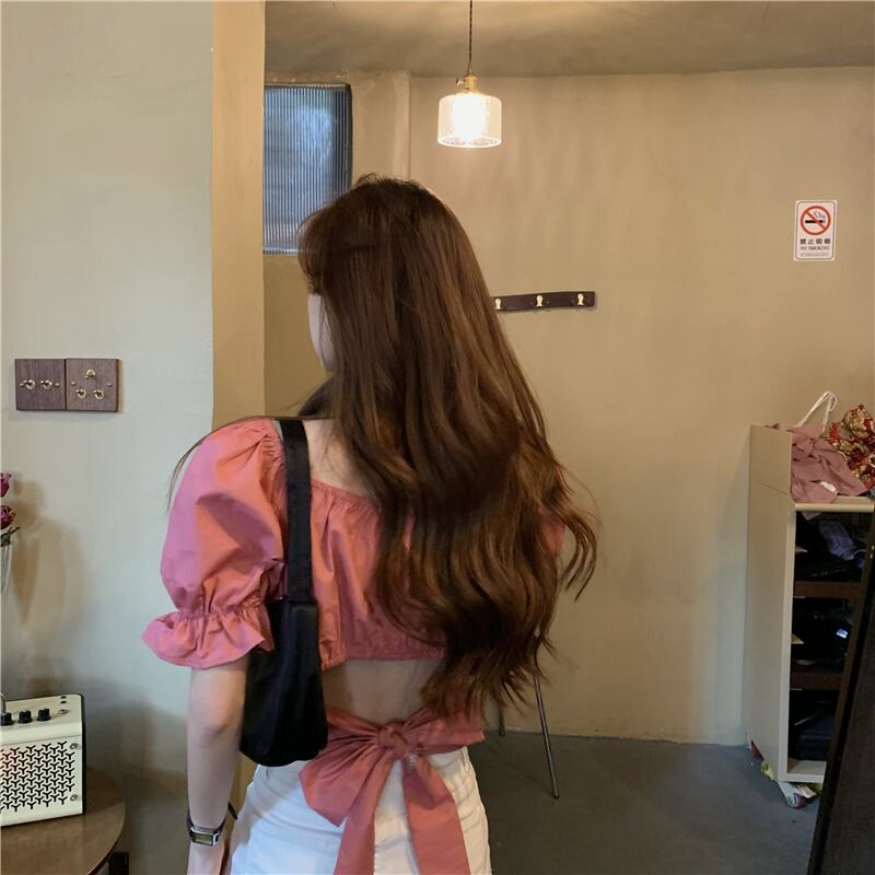 2カラー バックリボン スクエアネック 半袖 シャツ ブラウス *bl289