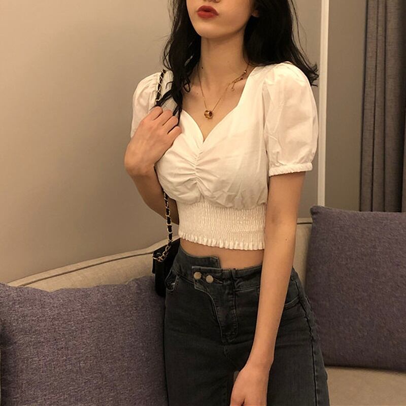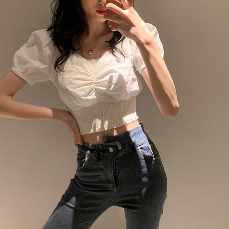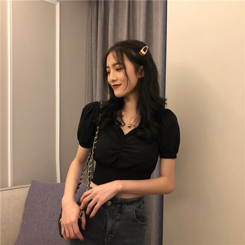 2カラー パフスリーブ Vネック 半袖 シャツ ブラウス *bl292