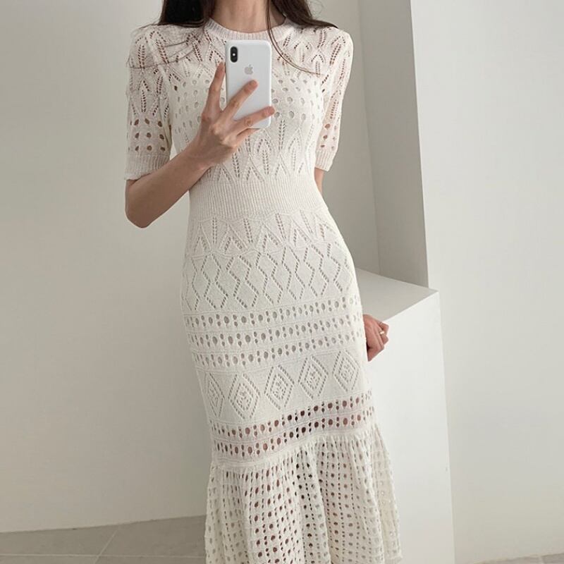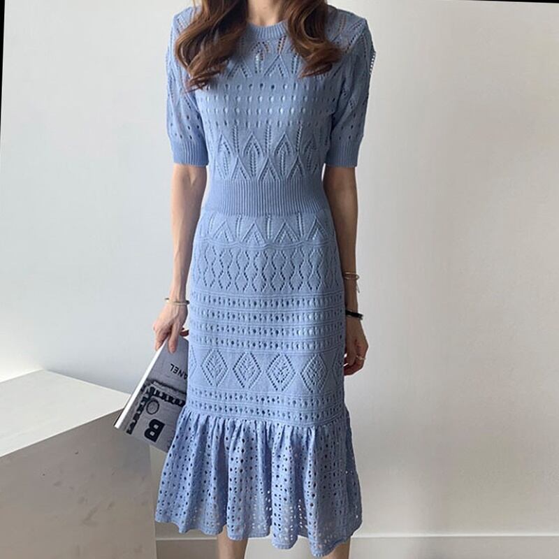 4カラー シアー 半袖 ニット 編み込み ワンピース *on624