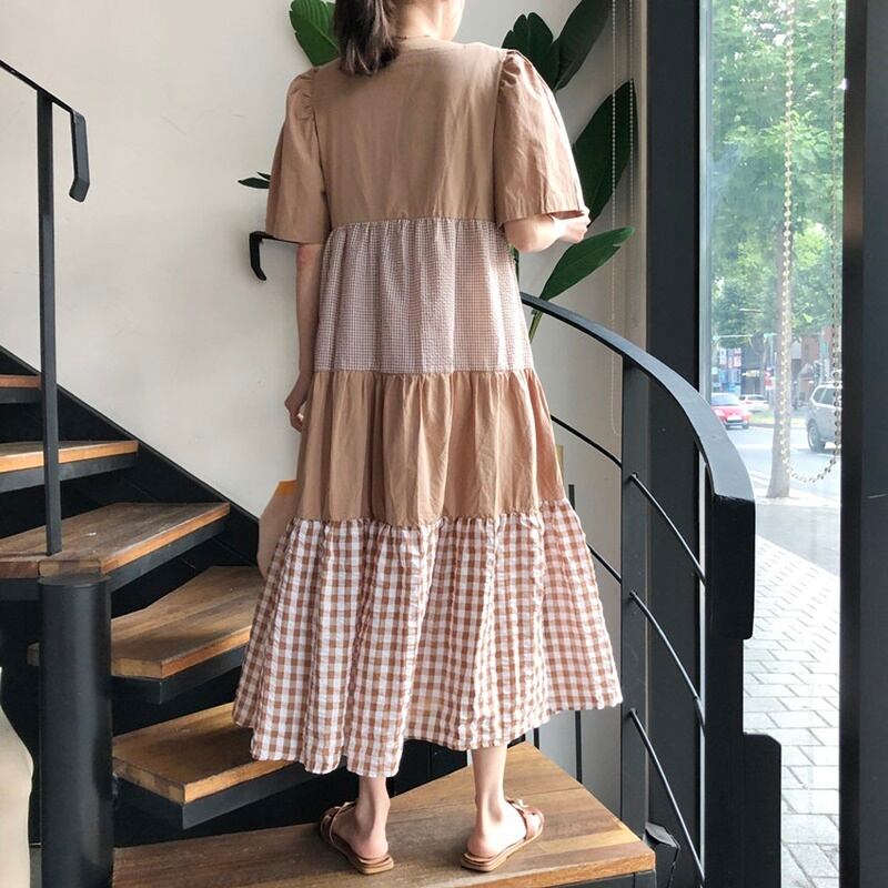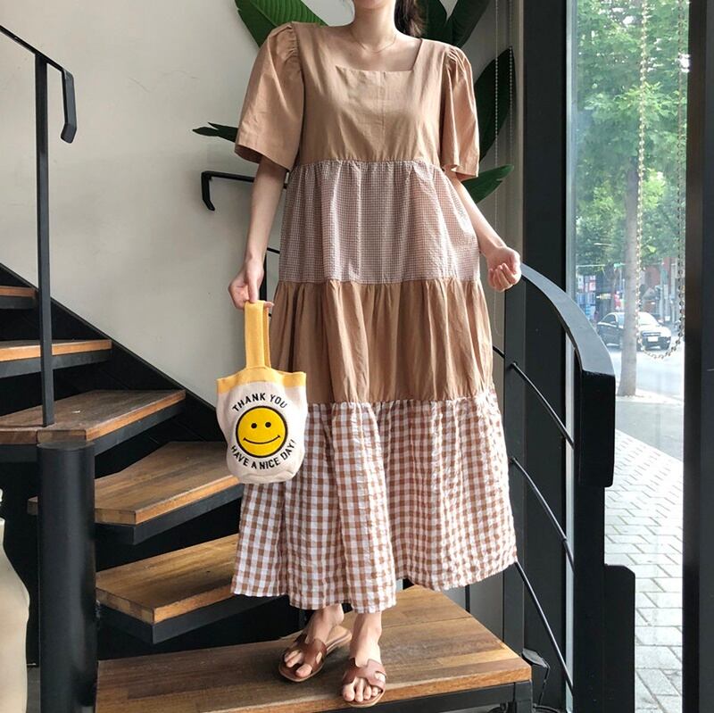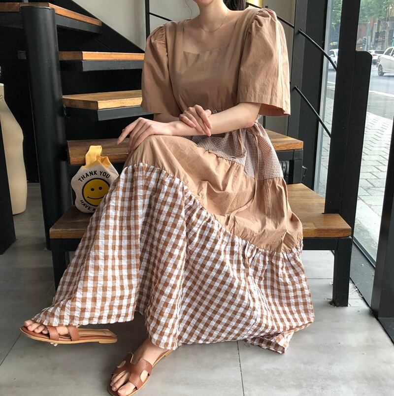 2カラー チェック柄 スクエアネック 半袖 ワンピース *on638