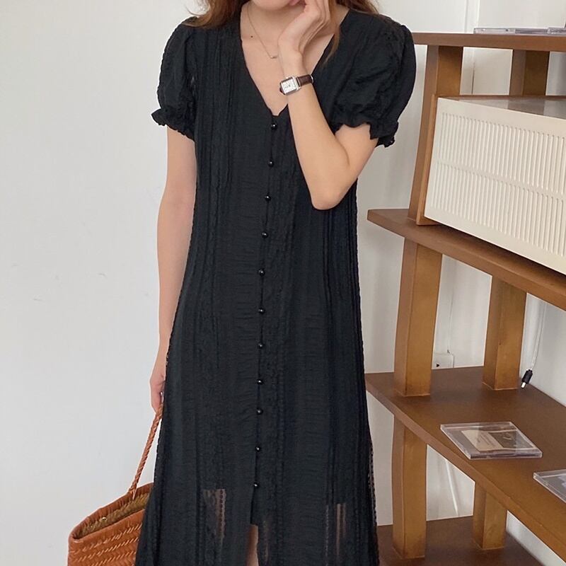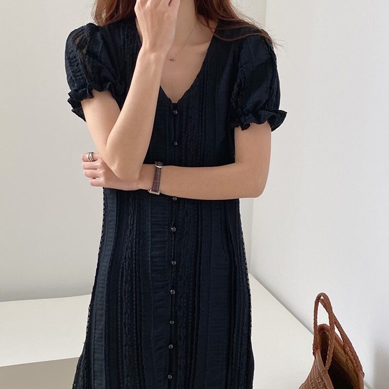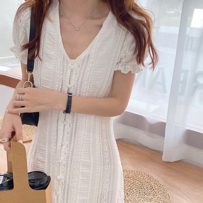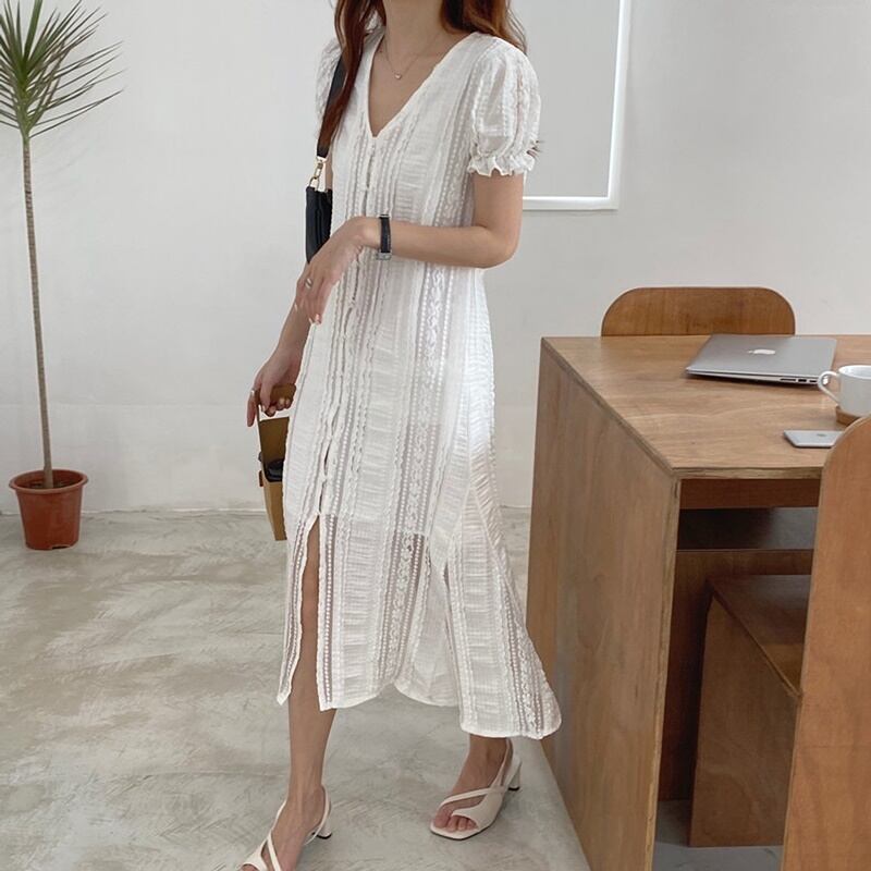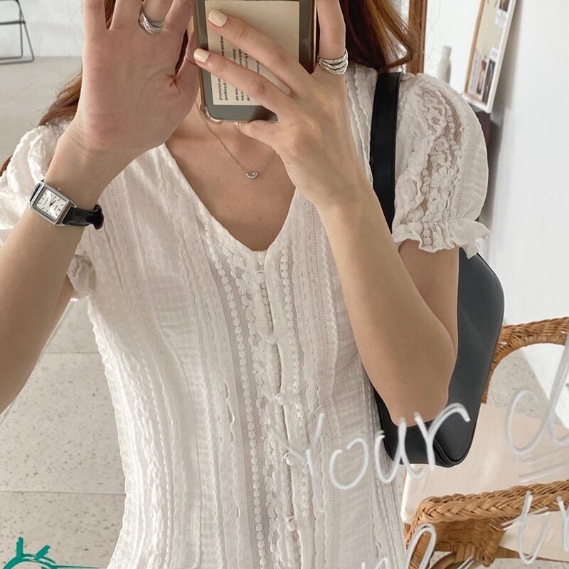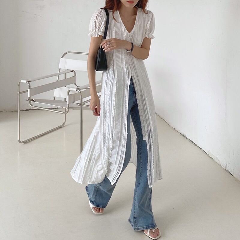 2カラー Vネック レース 半袖 シャツワンピース *on649