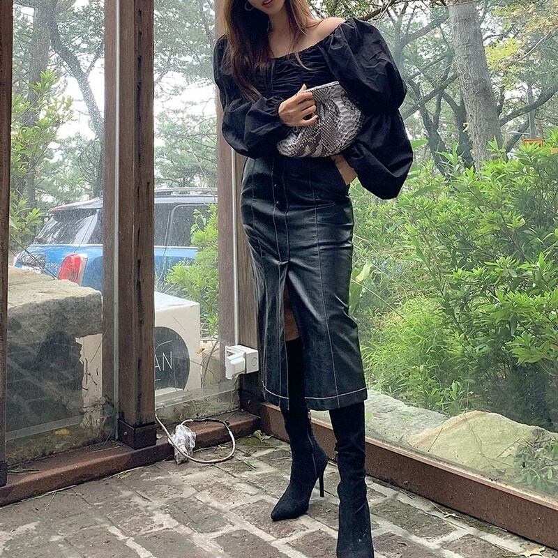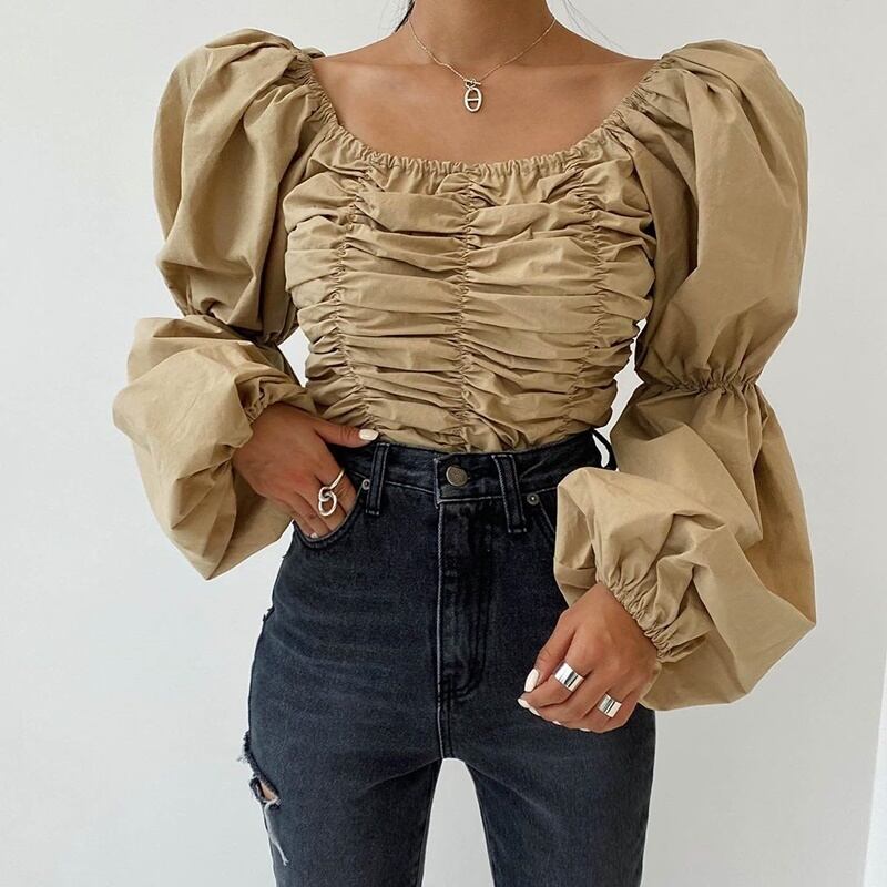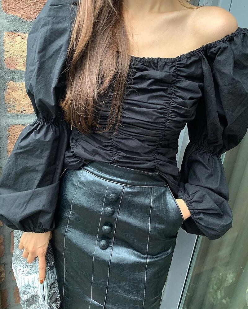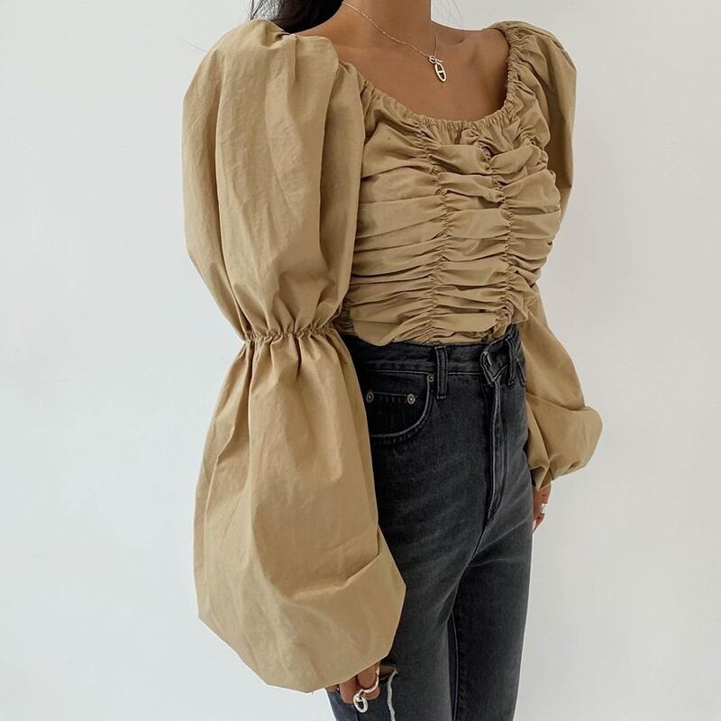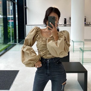 2カラー ギャザー スクエアネック 長袖 シャツ ブラウス *bl298
