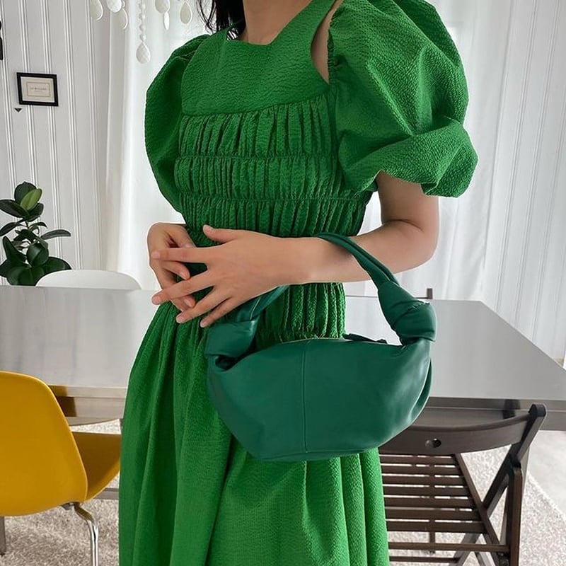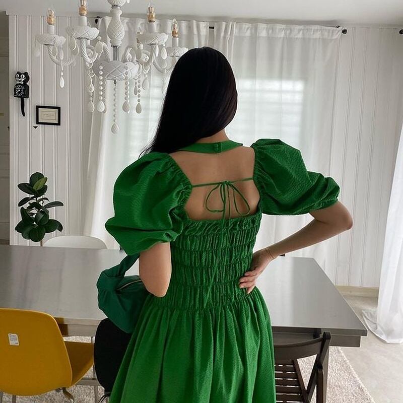 ホルターネック パフスリーブ バックリボン 半袖 ワンピース *on653