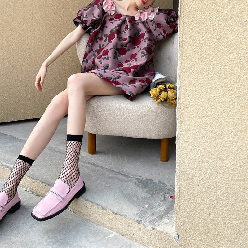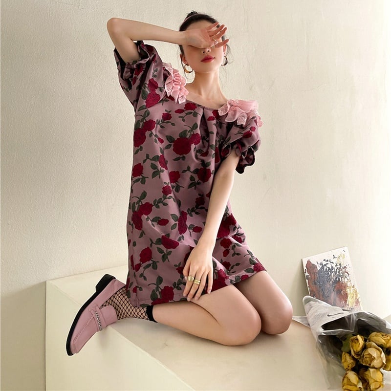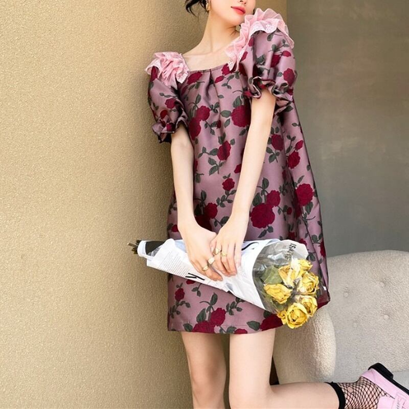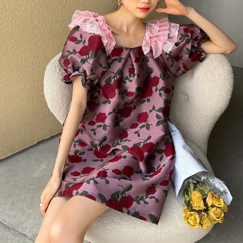 花柄 薔薇 フリル スクエアネック 半袖 ワンピース *on656
