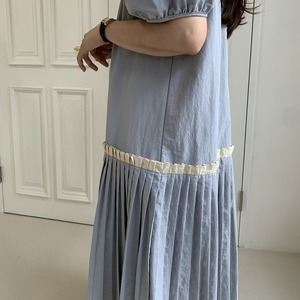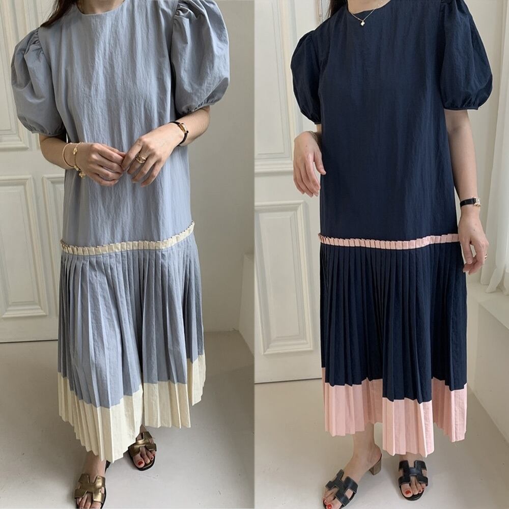 2カラー ボーダー プリーツ ラウンドネック 半袖 ワンピース *on671