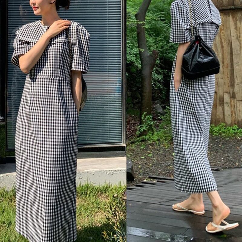 チェック柄 ラウンドネック 半袖 ワンピース *on673