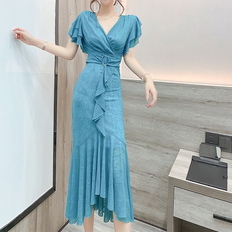3カラー フリル Vネック シフォン 半袖 ワンピース *on679