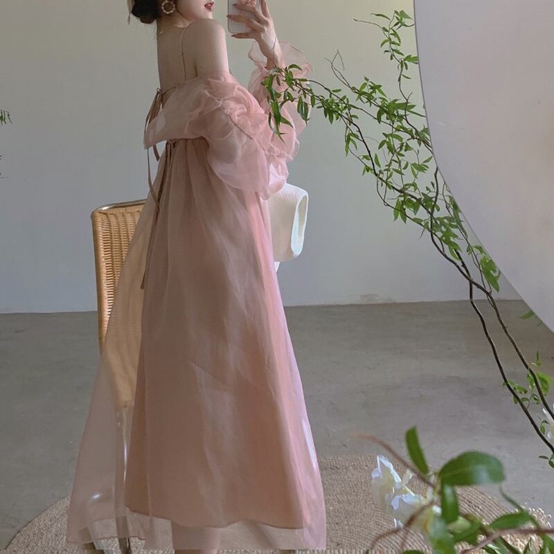 シアー Vネック シフォン オフショルダー 長袖 ワンピース *on680