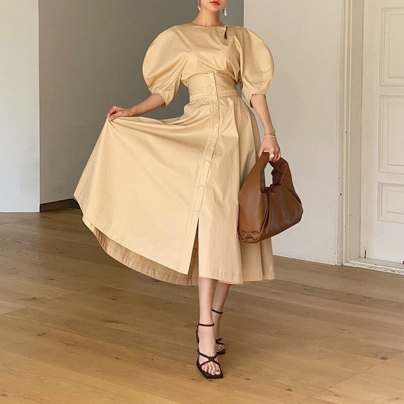 パフスリーブ ラウンドネック 半袖 ブラウス ハイウエスト スカート *on685