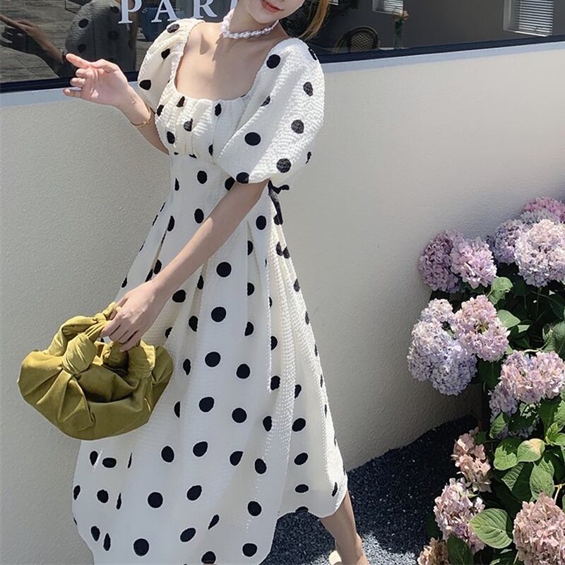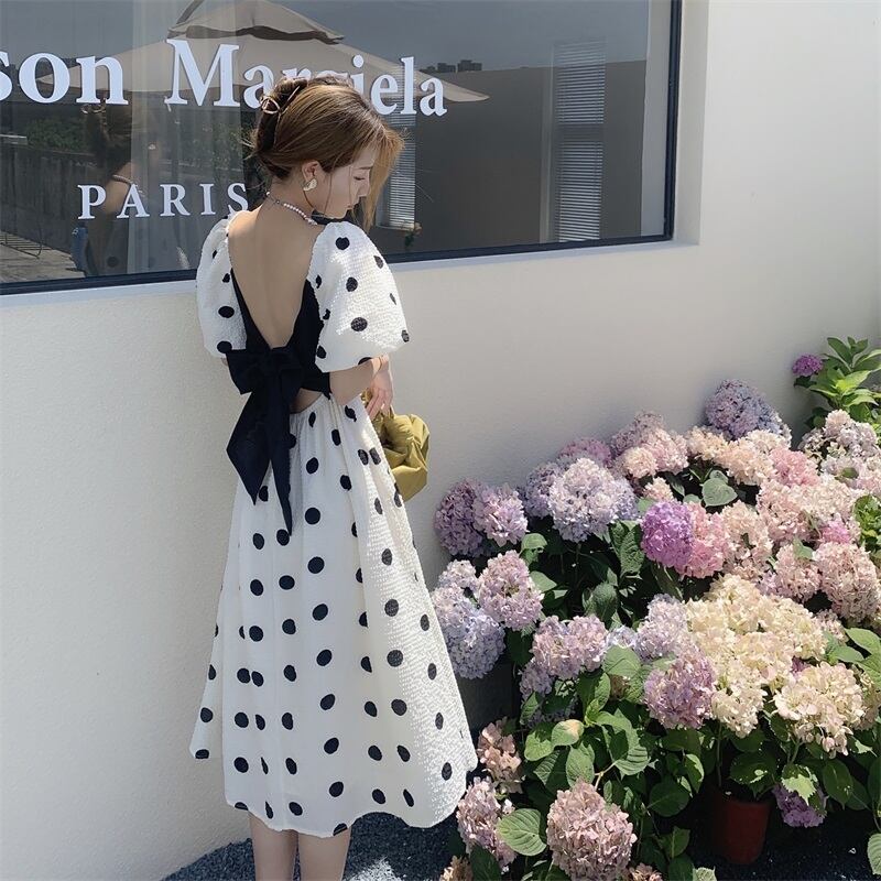 水玉柄 スクエアネック バックリボン 半袖 ワンピース *on683