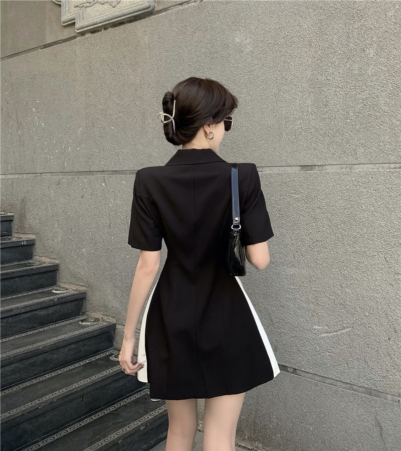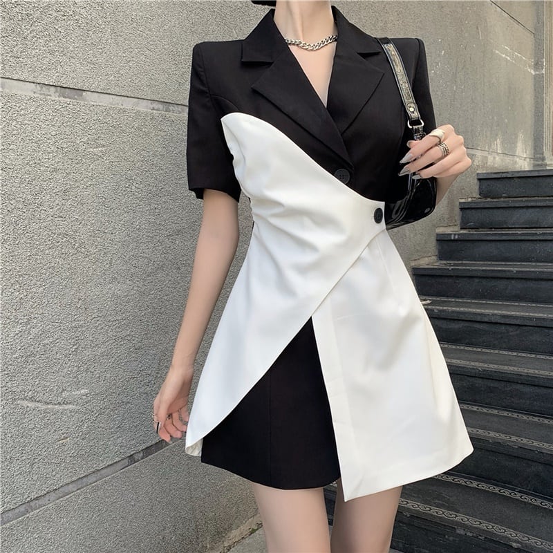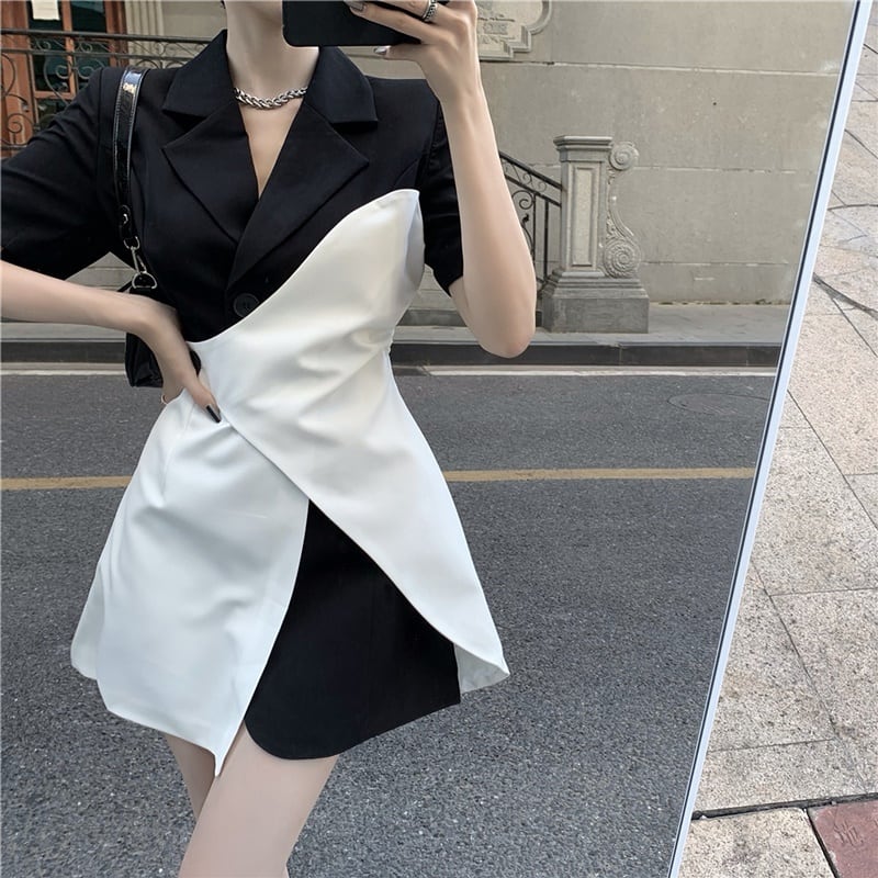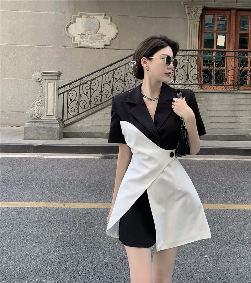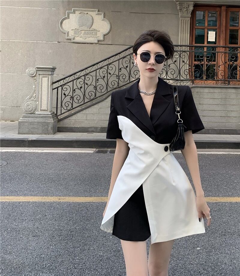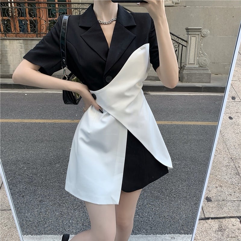 アシンメトリー バイカラー Vネック 半袖 ワンピース *on687