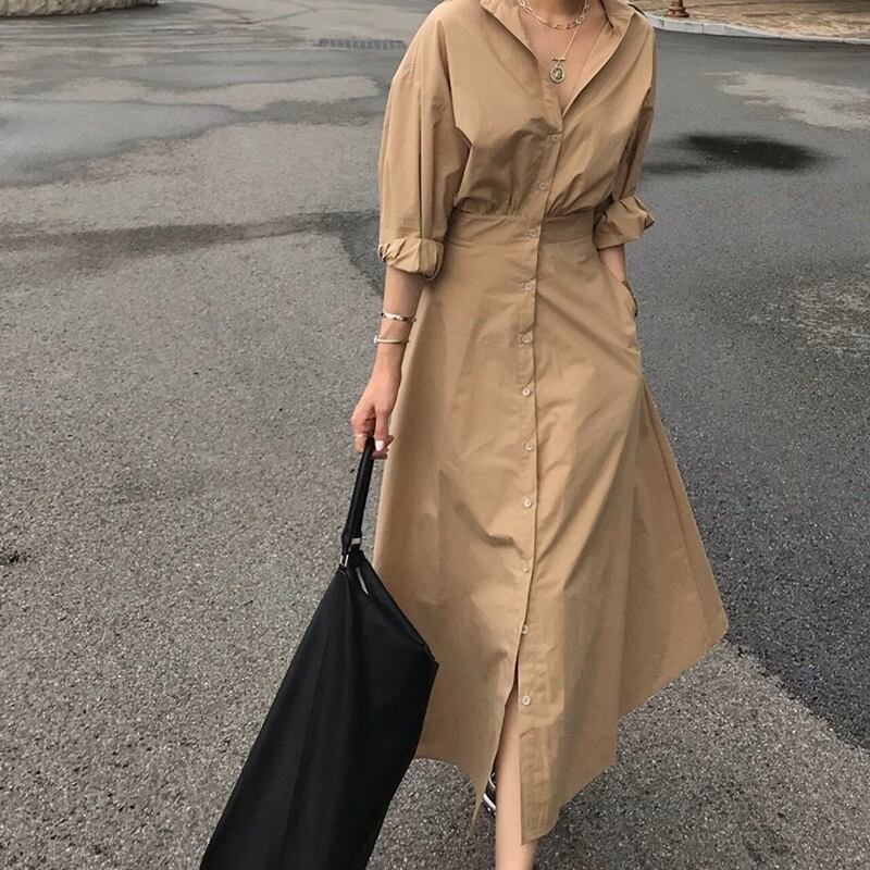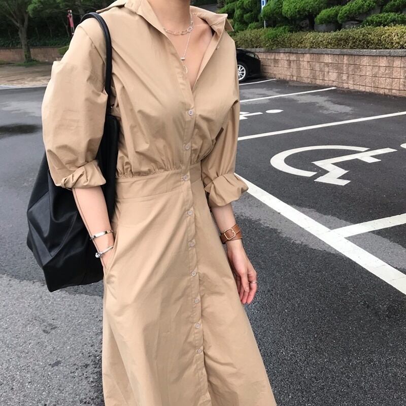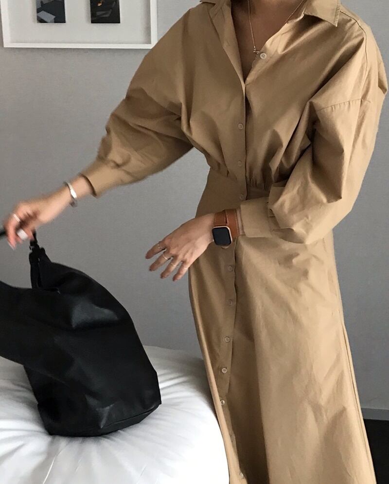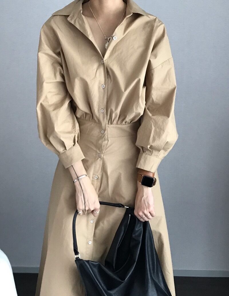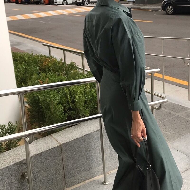 2カラー レトロ Vネック 長袖 シャツワンピース *on695