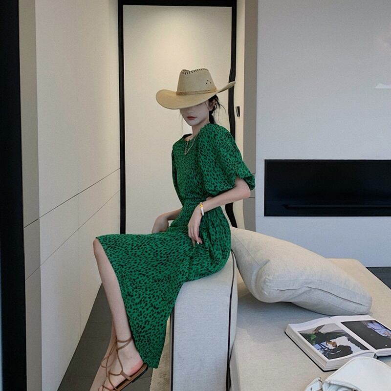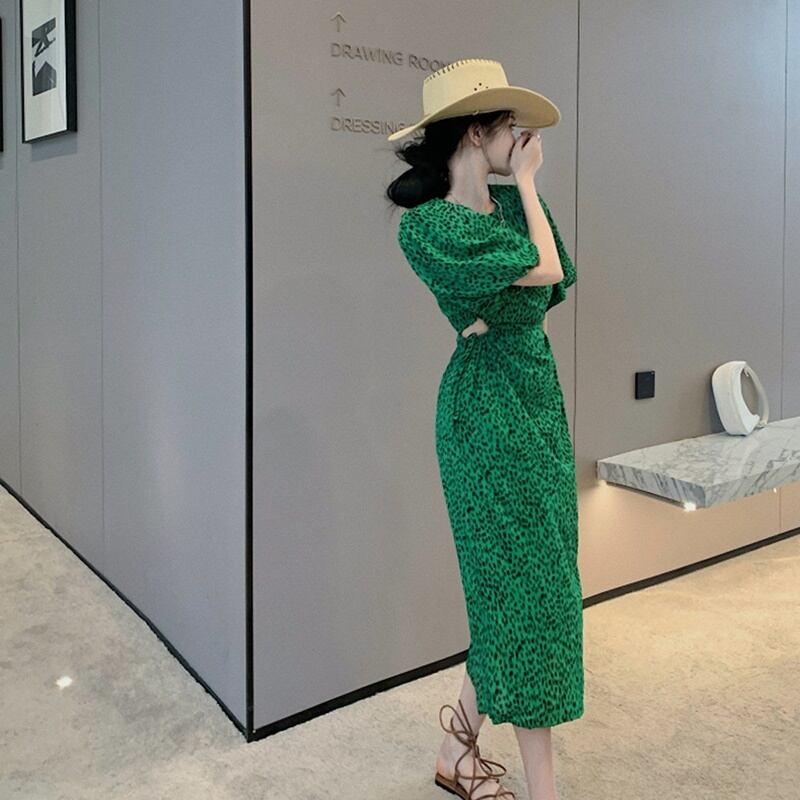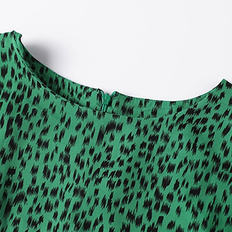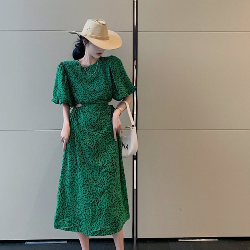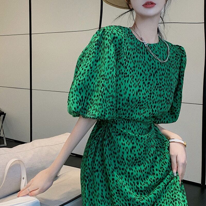 ヒョウ柄 パフスリーブ ラウンドネック 半袖 ワンピース *on697