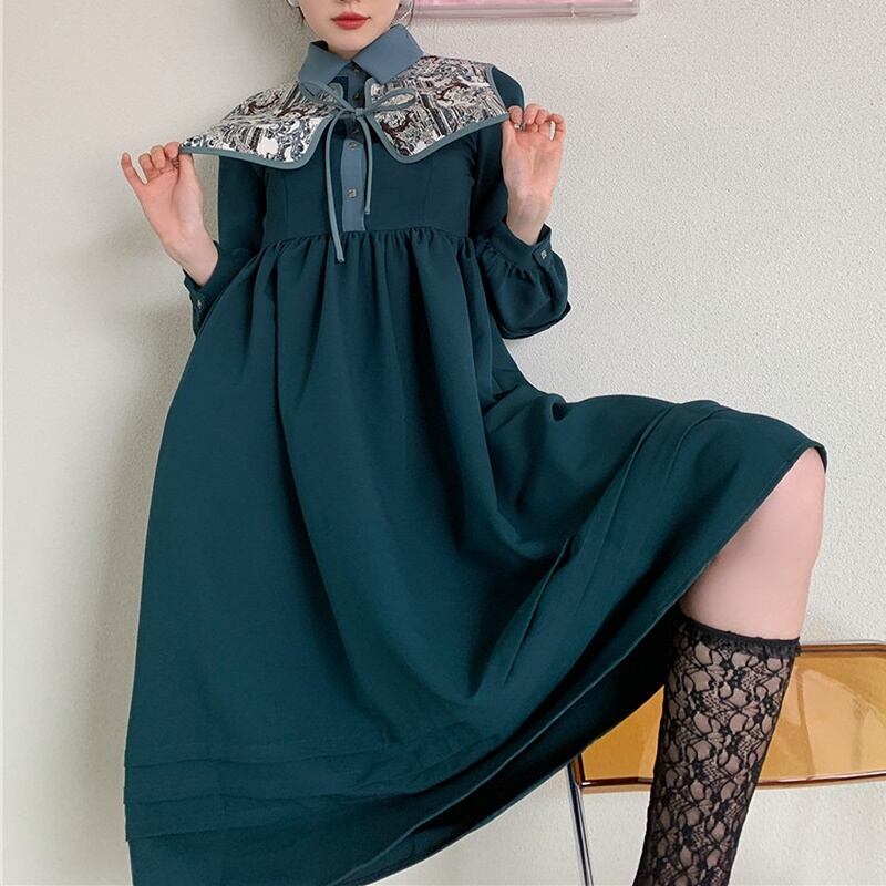 レトロ 長袖 ひざ丈 ドレス ワンピース *on701