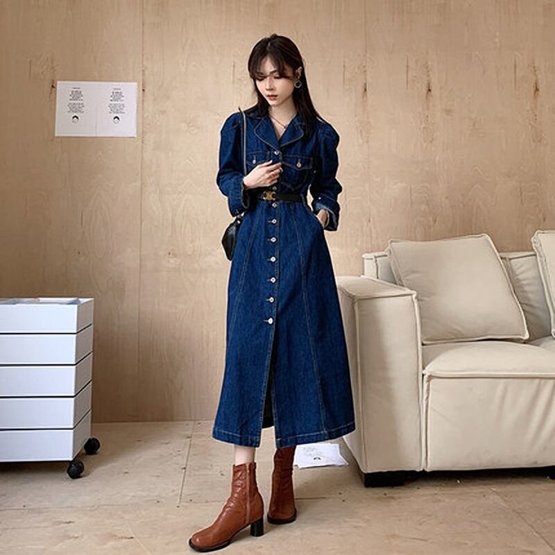 デニム 長袖 Vネック ロング ボタン ワンピース *on707