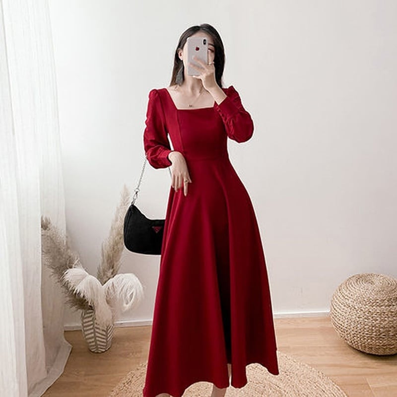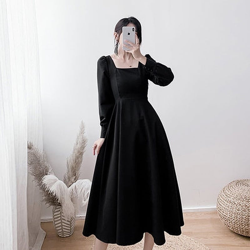 3カラー スクエアネック 長袖 ロング ドレス ワンピース *on708