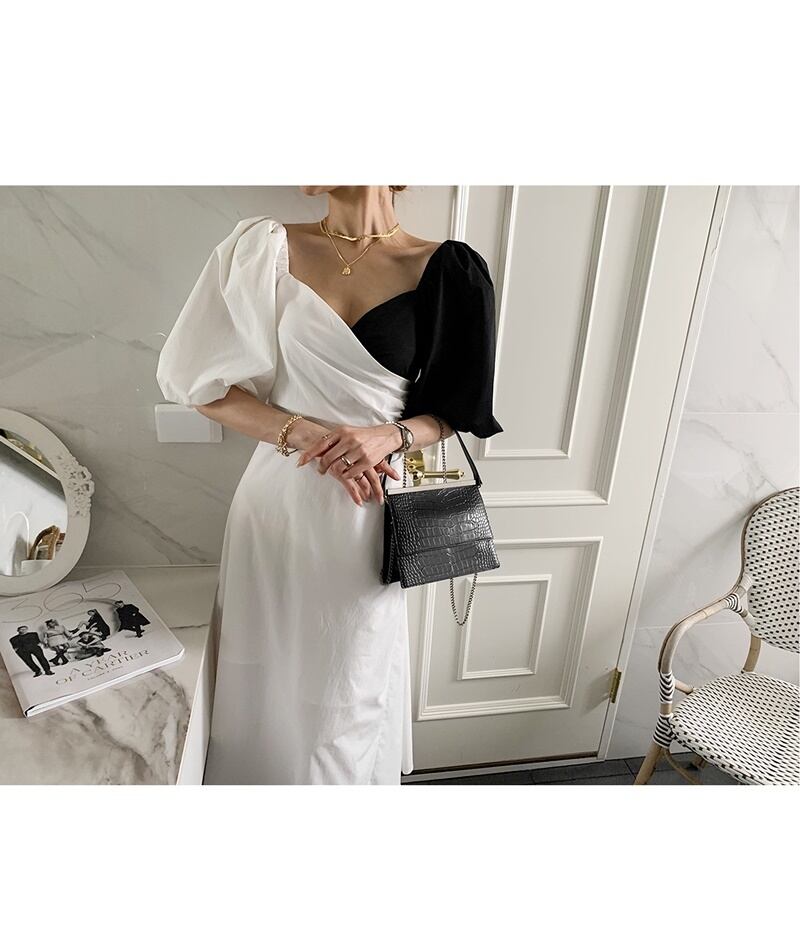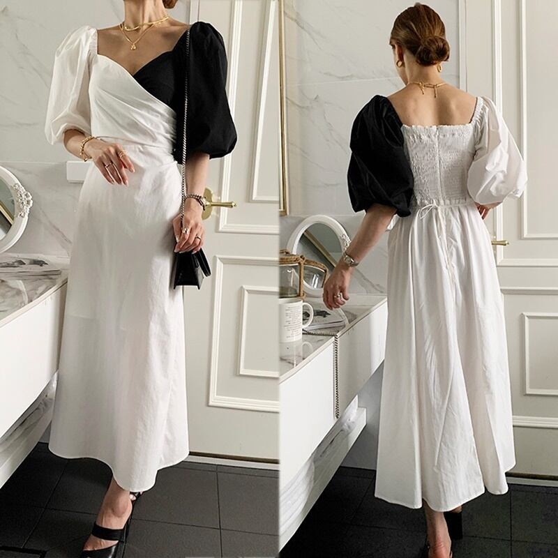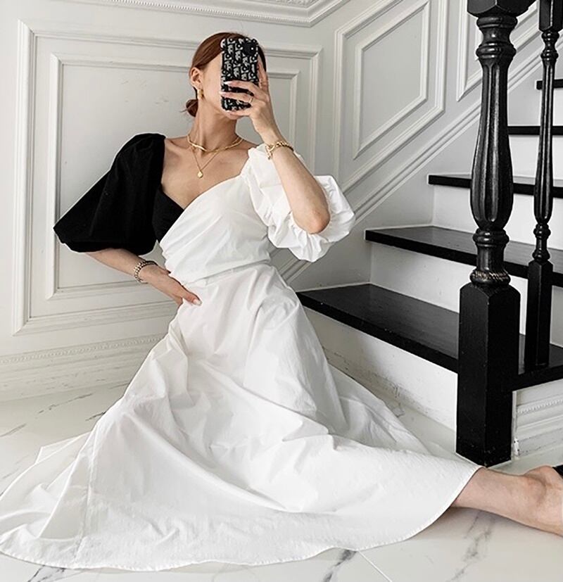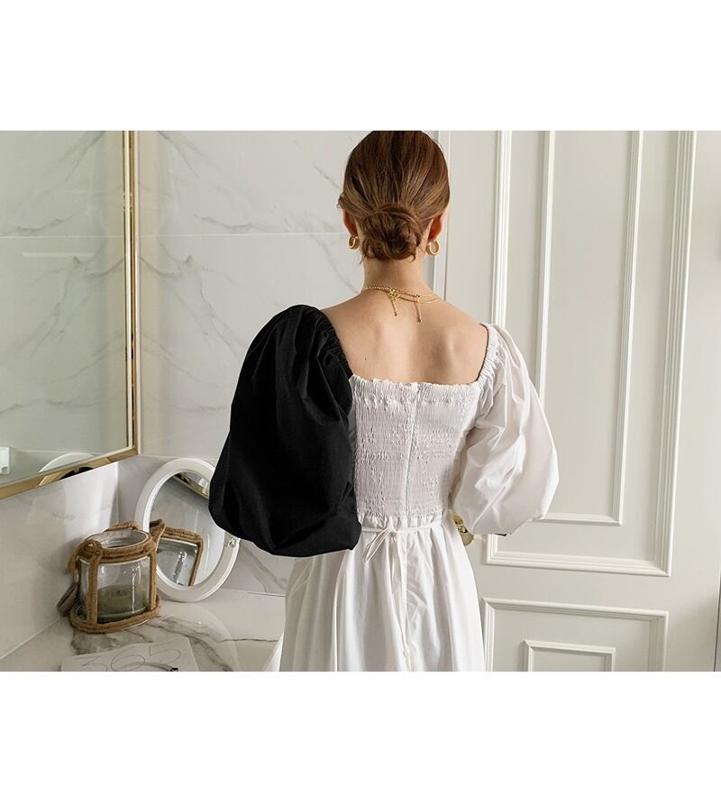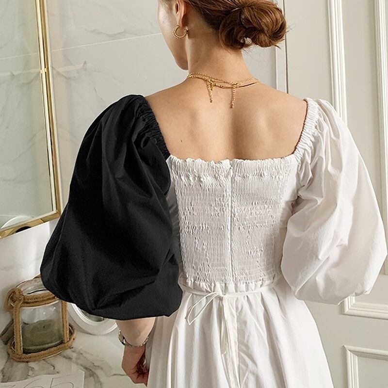 パフスリーブ 半袖 スクエアネック バイカラー ワンピース *on711