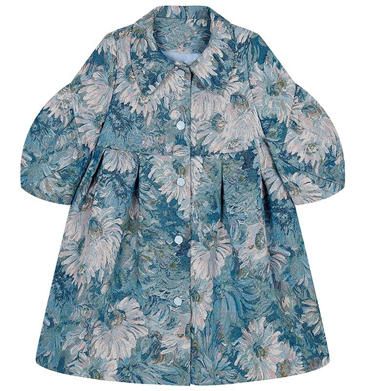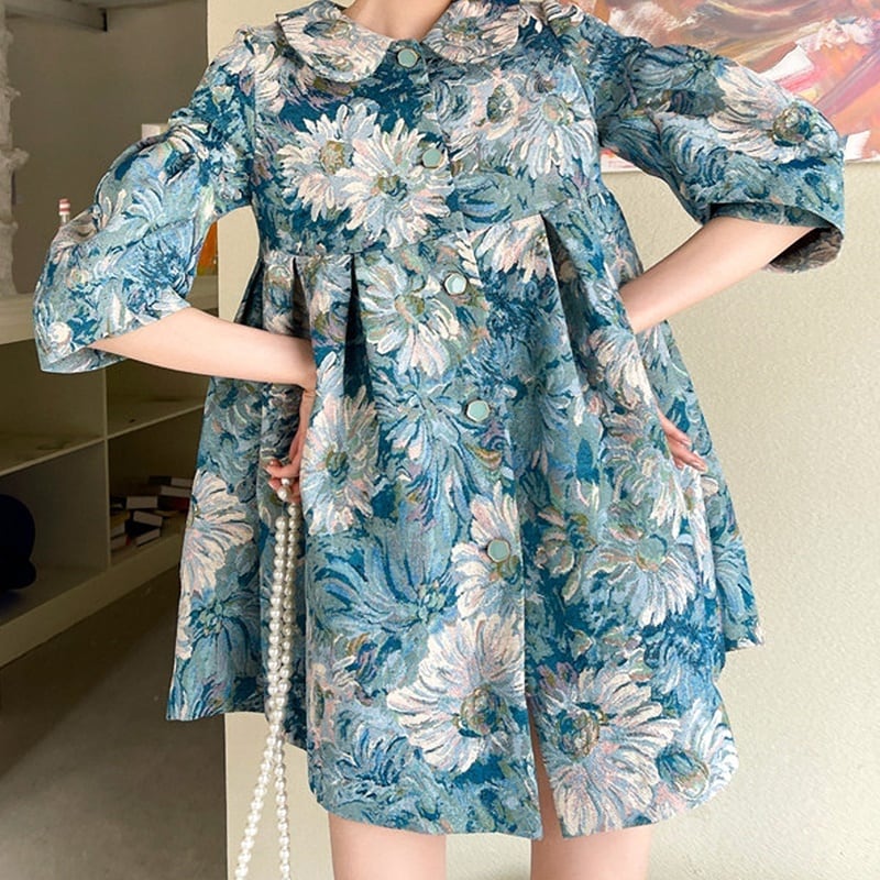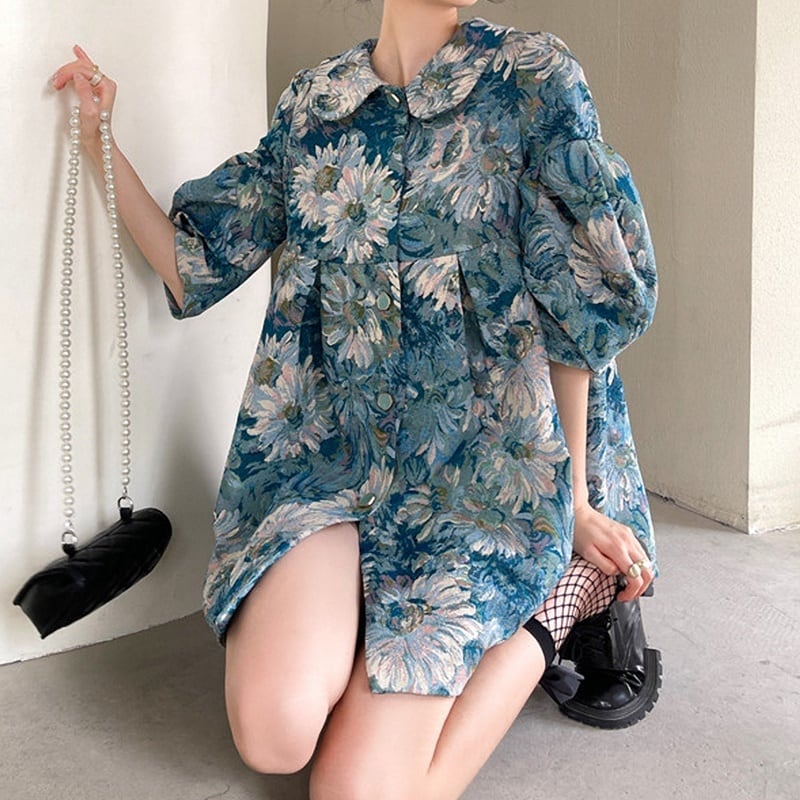 パフスリーブ 半袖 花柄 ミニ丈 シャツワンピース *on712