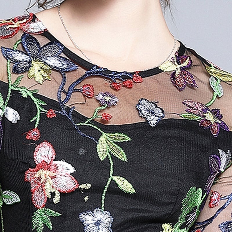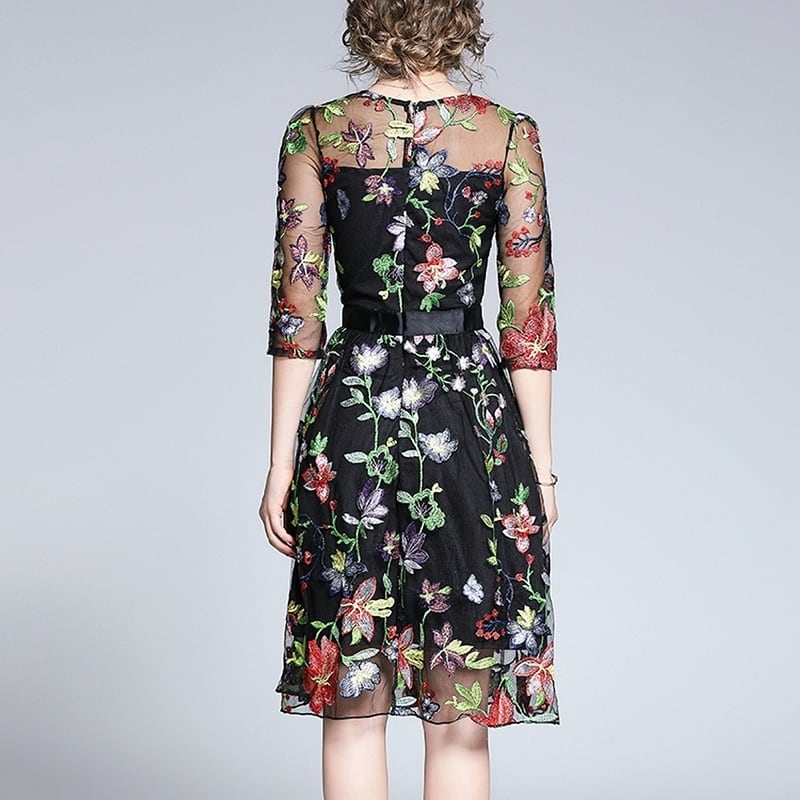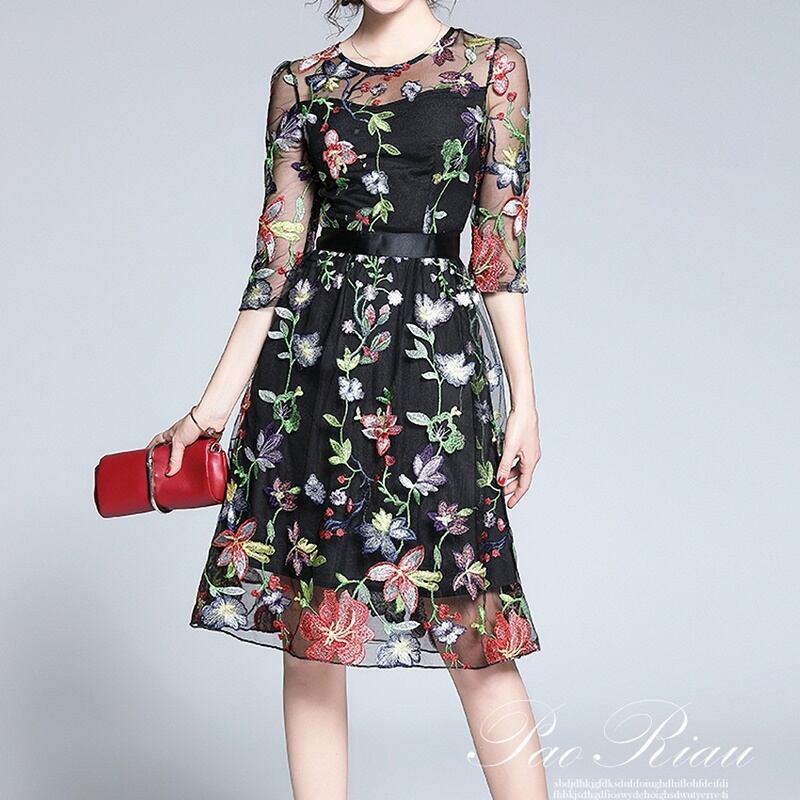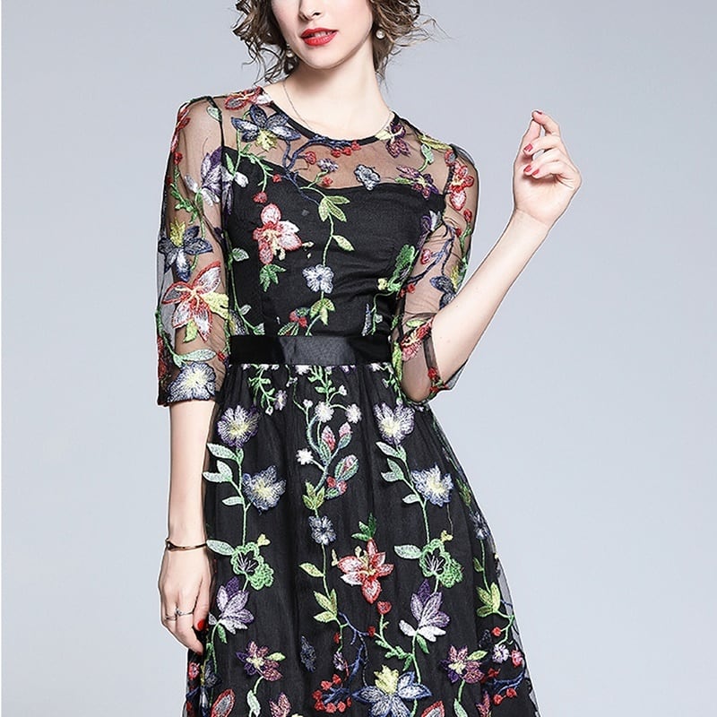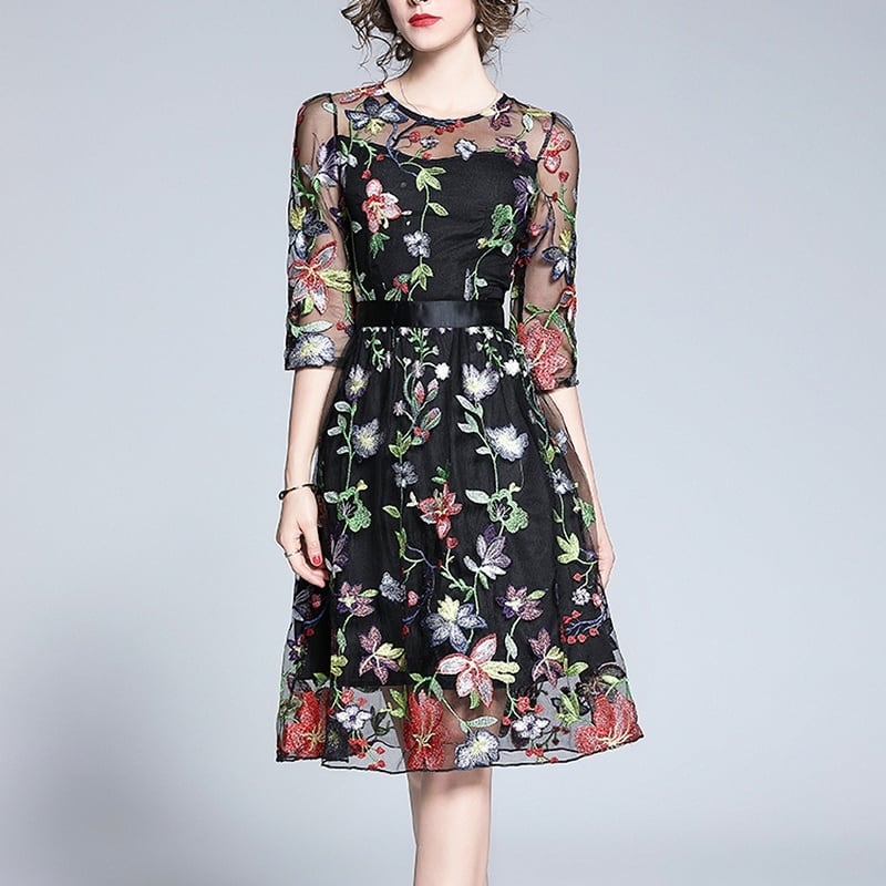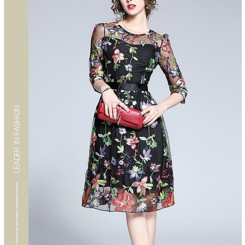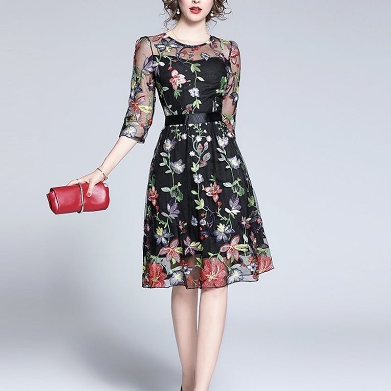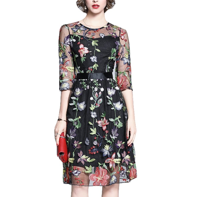 コピー:花柄 七分袖 シアー 刺繍 ひざ丈 ドレス ワンピース *on718