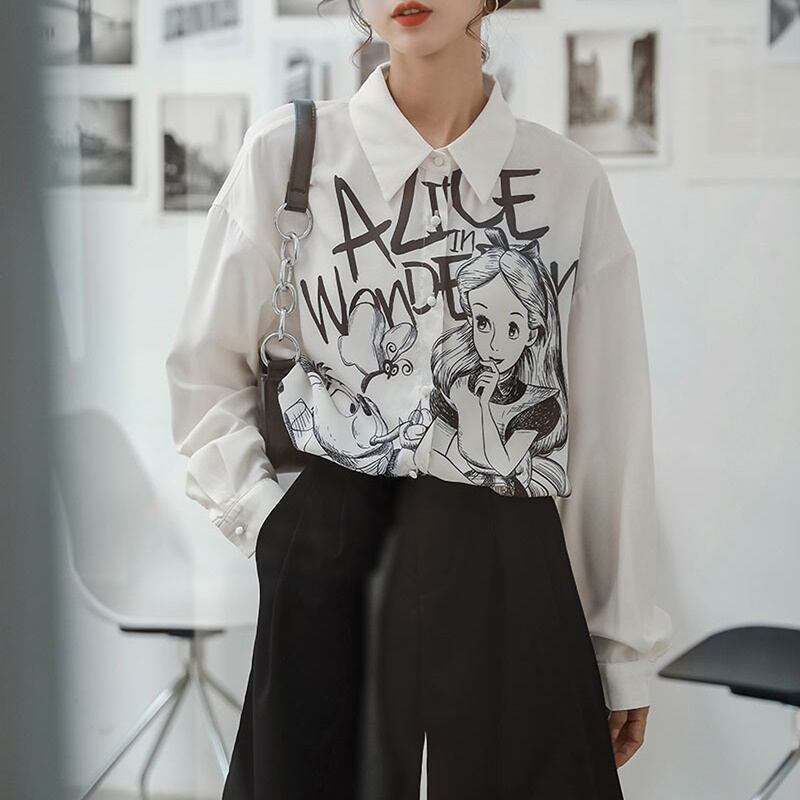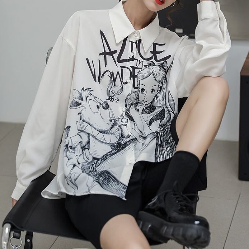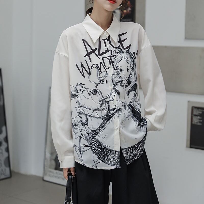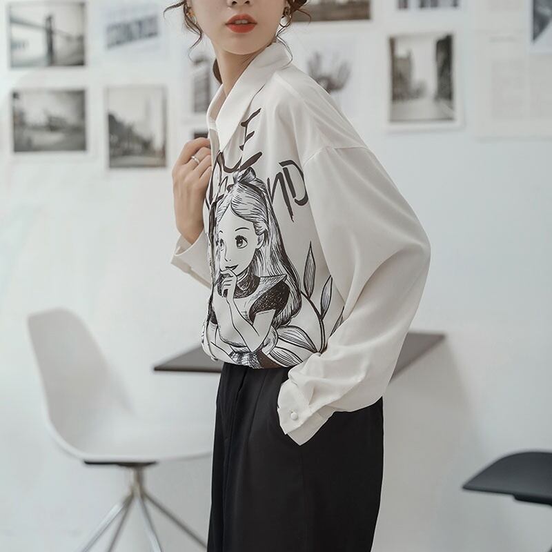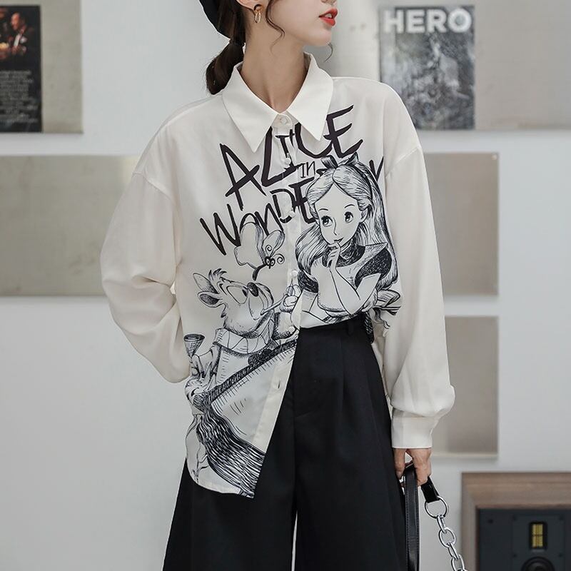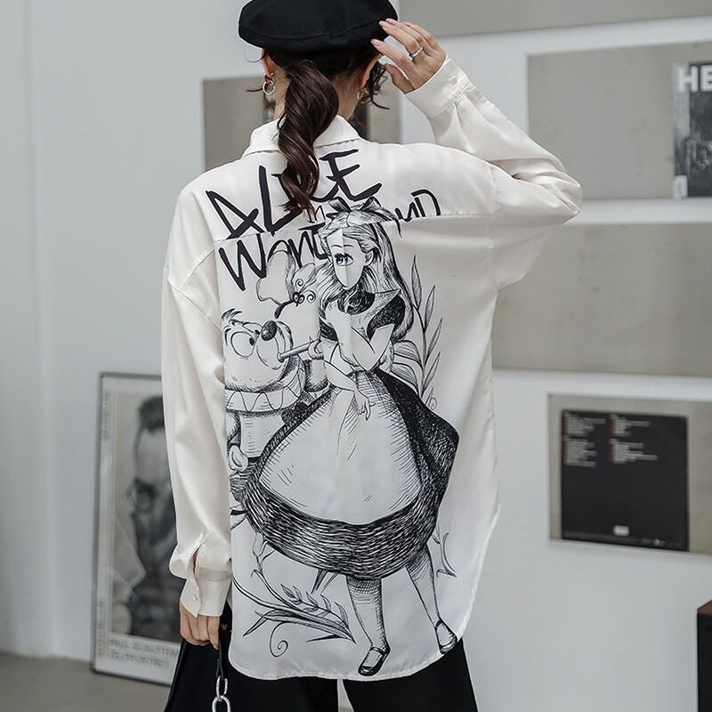 イラスト柄 シフォン 長袖 シャツ ブラウス *bl343