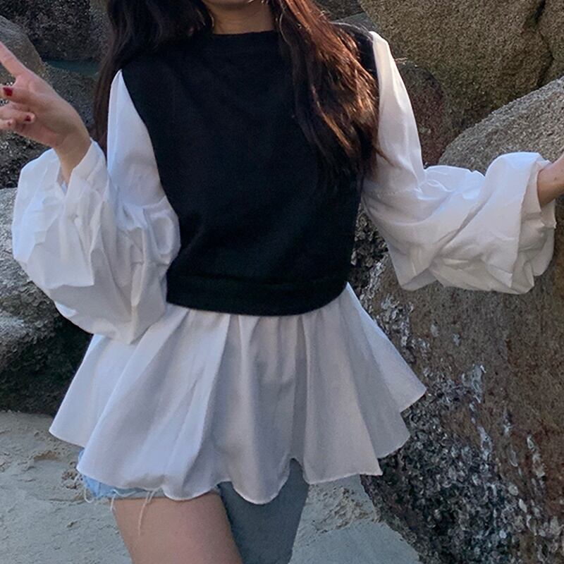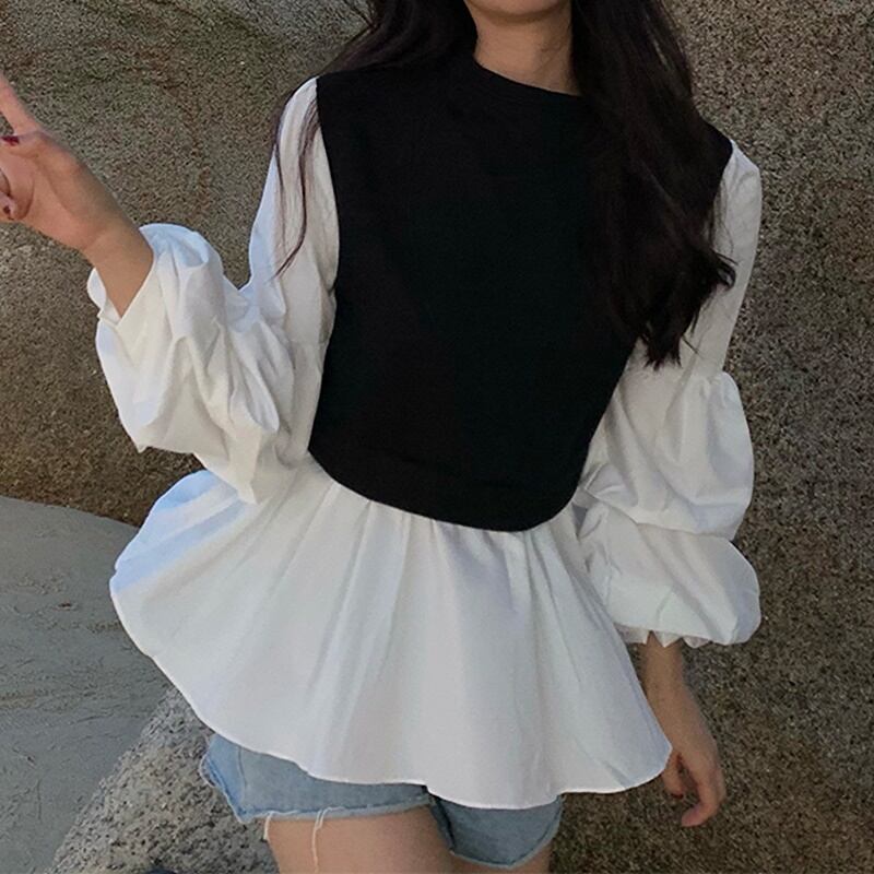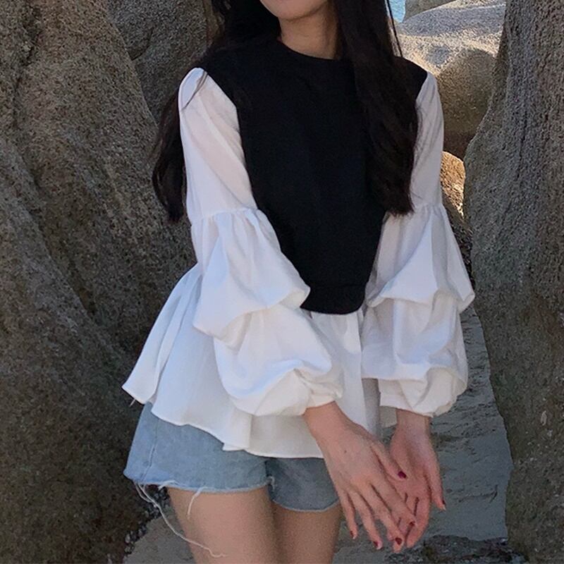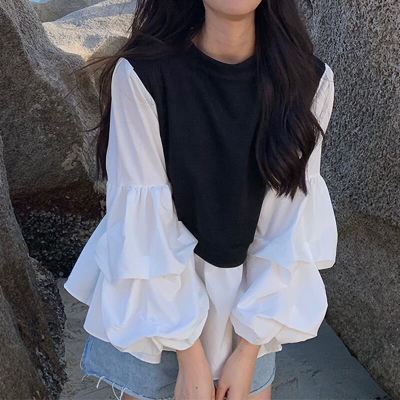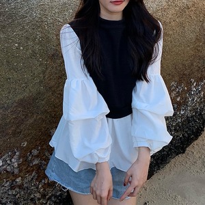 ギャザー ボリューム袖 ラウンドネック 長袖 シャツ ブラウス *set067