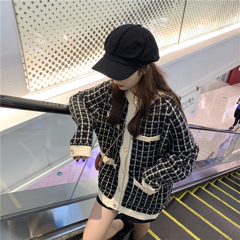 2カラー チェック柄 ラウンドネック 長袖 ニット カーディガン *ca055