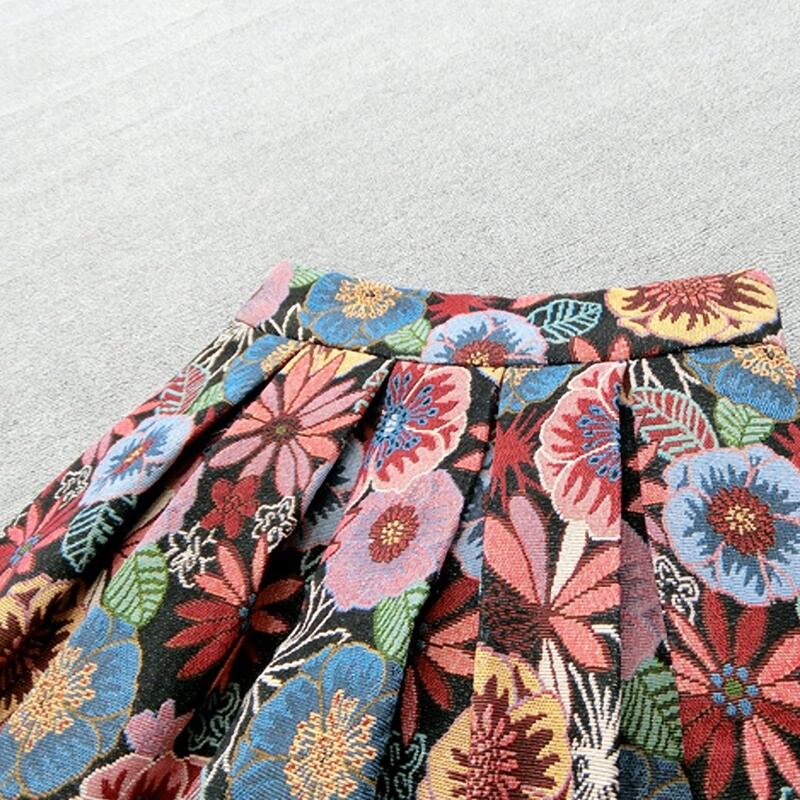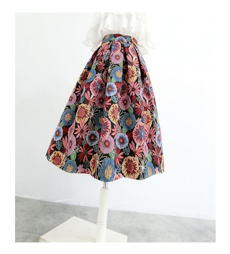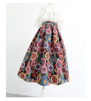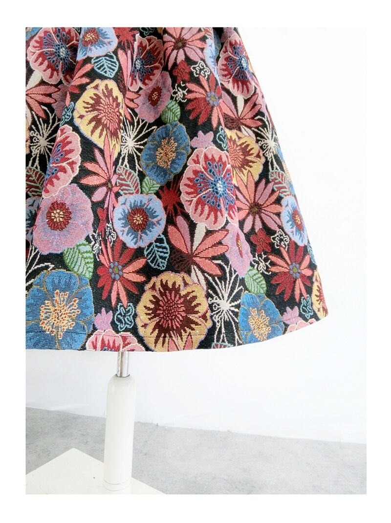 秋を感じさせる配色の花柄Aラインスカートです。