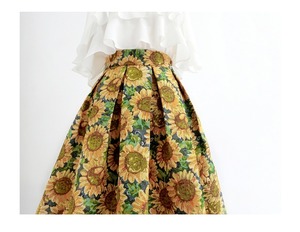 ひまわり 花柄 刺繍 ハイウエスト Aライン スカート *sk166