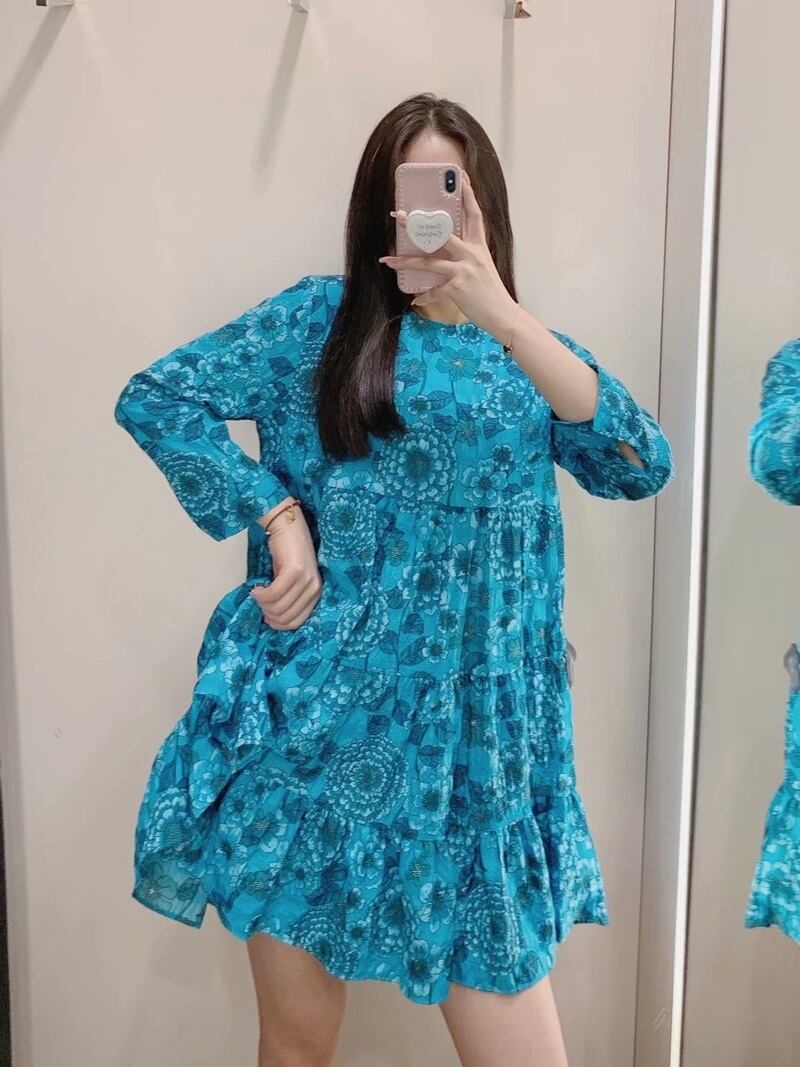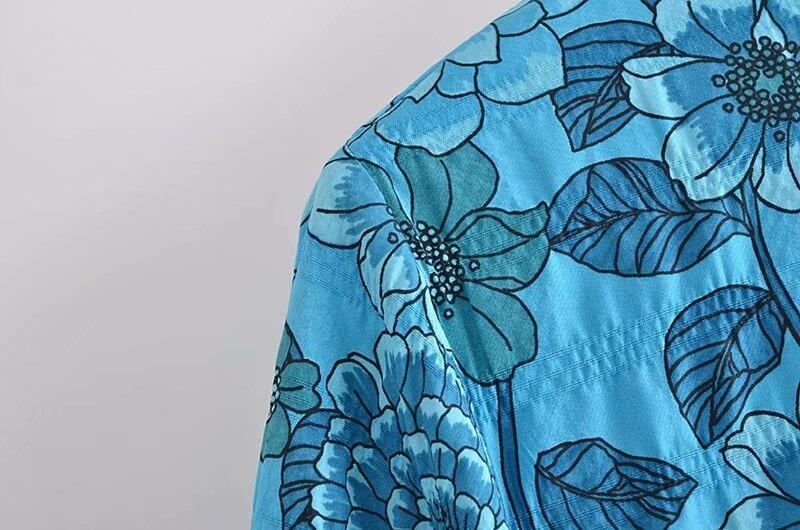 涼し気なブルーの花柄が大人っぽいシャツです。