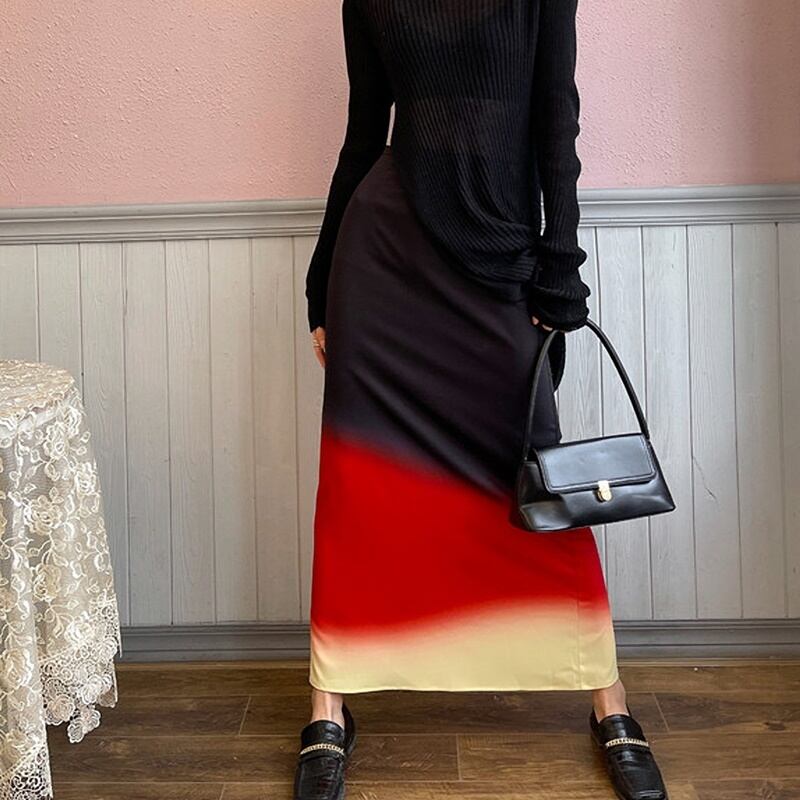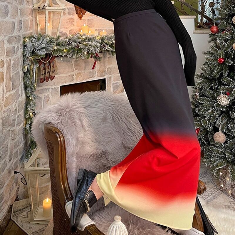 はっきりとした配色のグラデーションカラーが個性的で目を引くスカート。