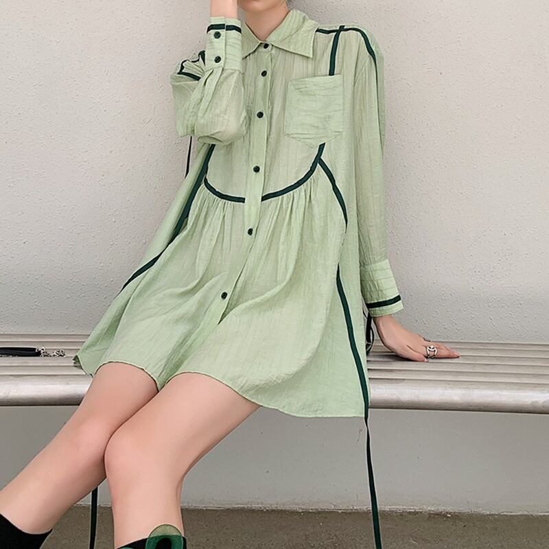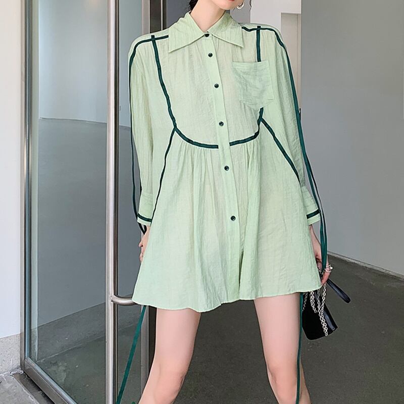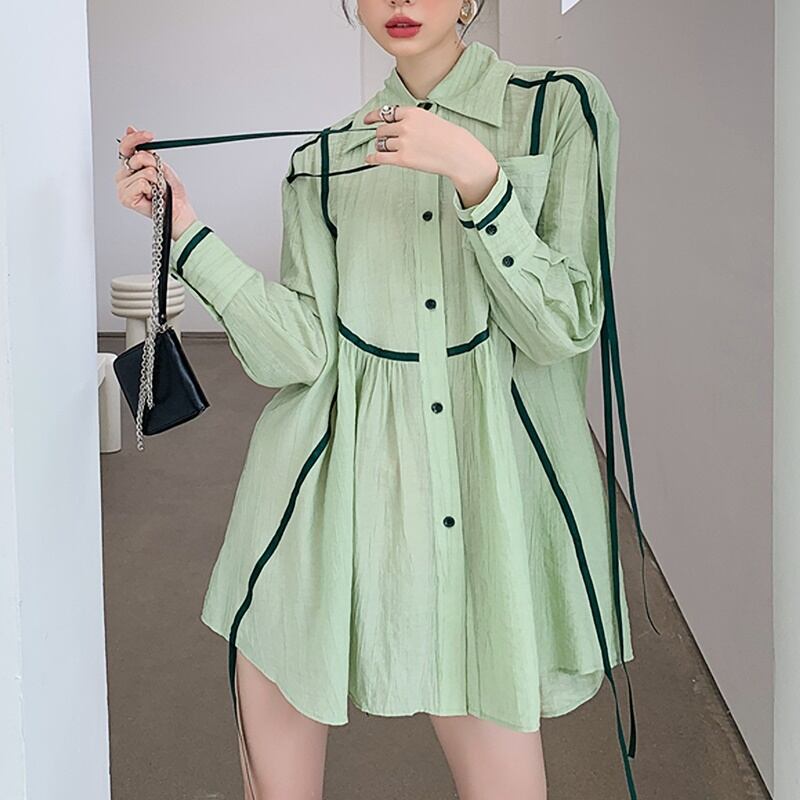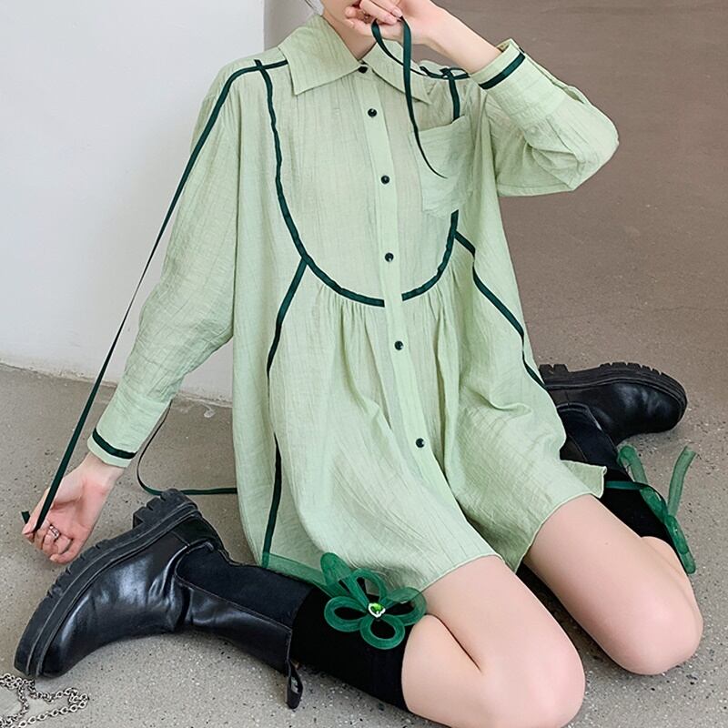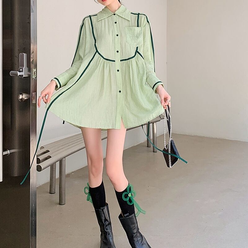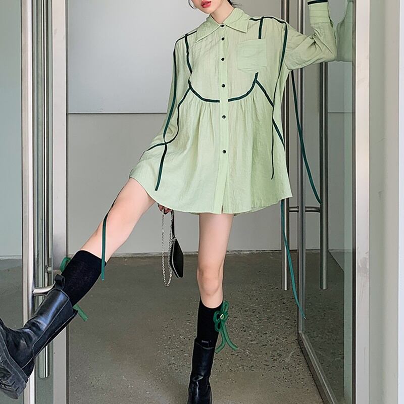 リボン ミニ丈 長袖 シャツワンピース *on740
