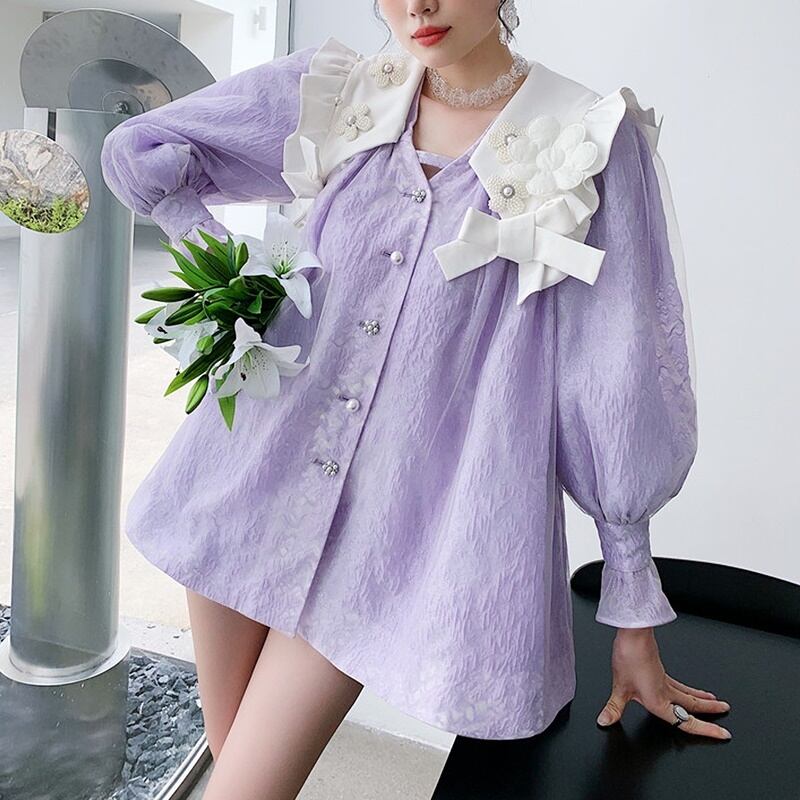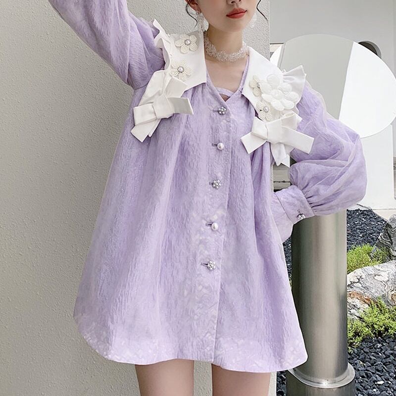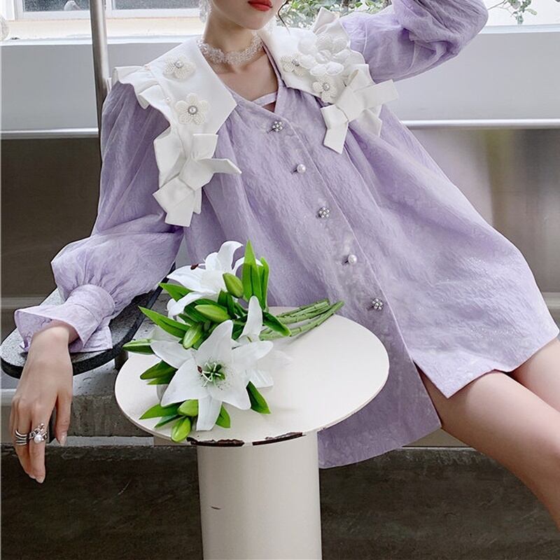 立体的なお花の刺繍やパールのボタンがお洒落。