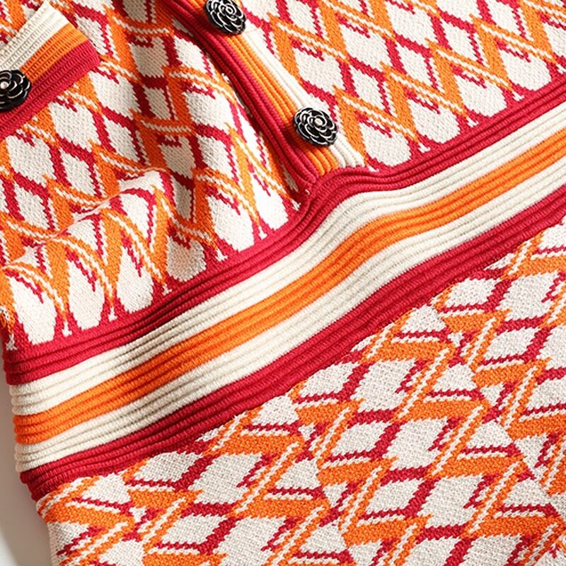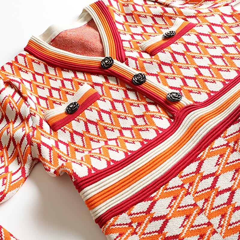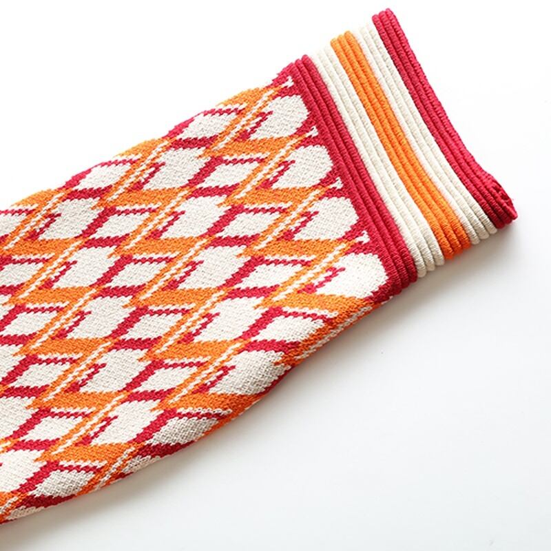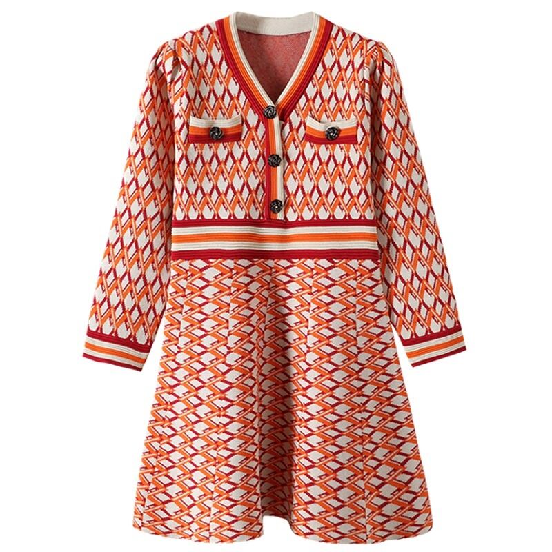 ダイヤ柄 Vネック Aライン 長袖 ワンピース *on743