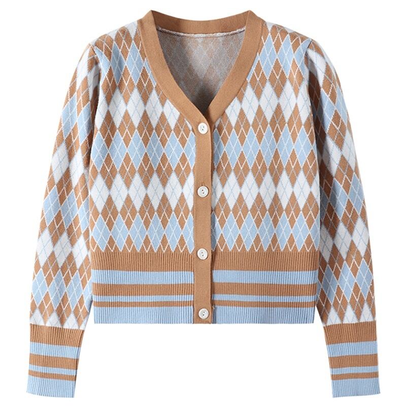 2カラー ダイヤ柄 Vネック 長袖 ニット カーディガン *ca073