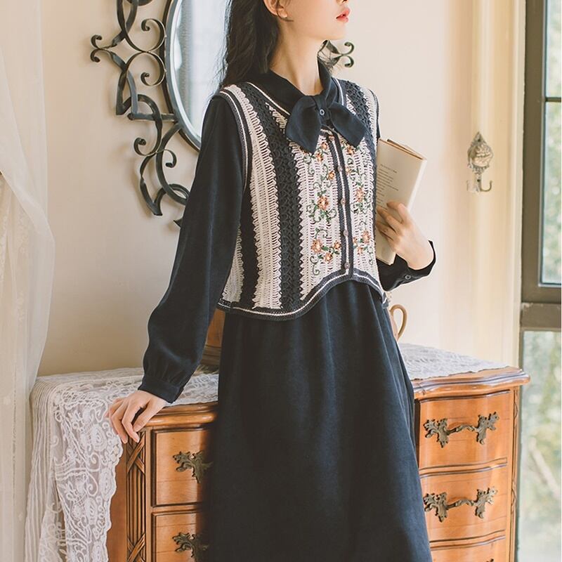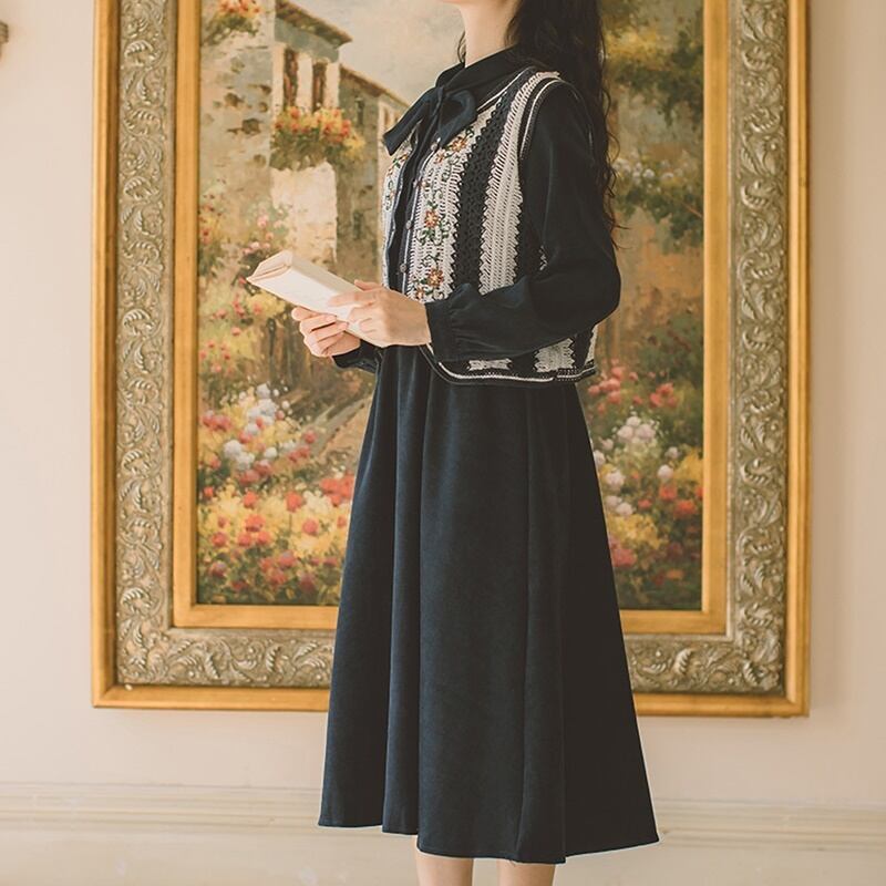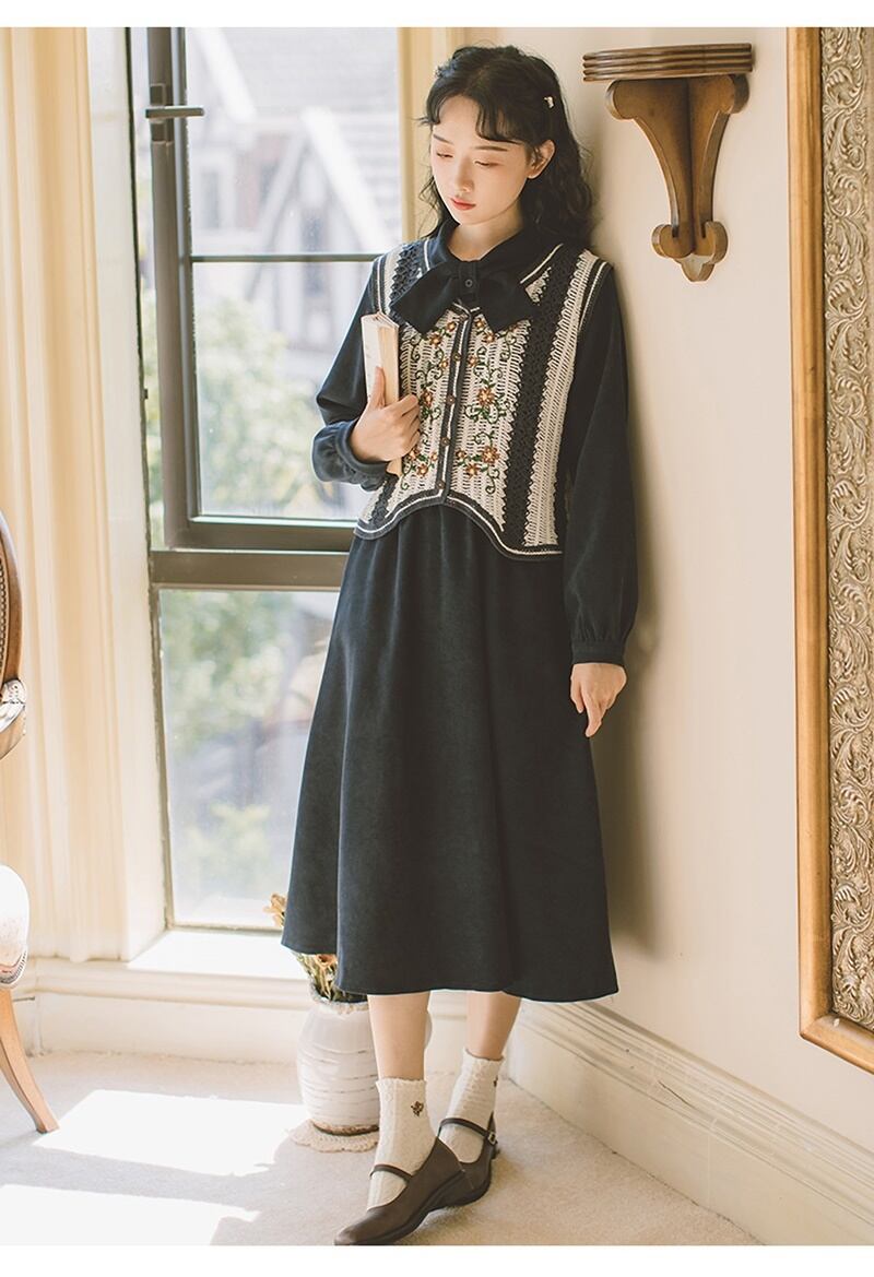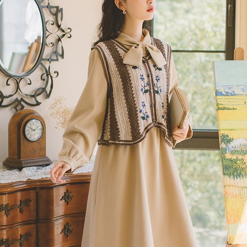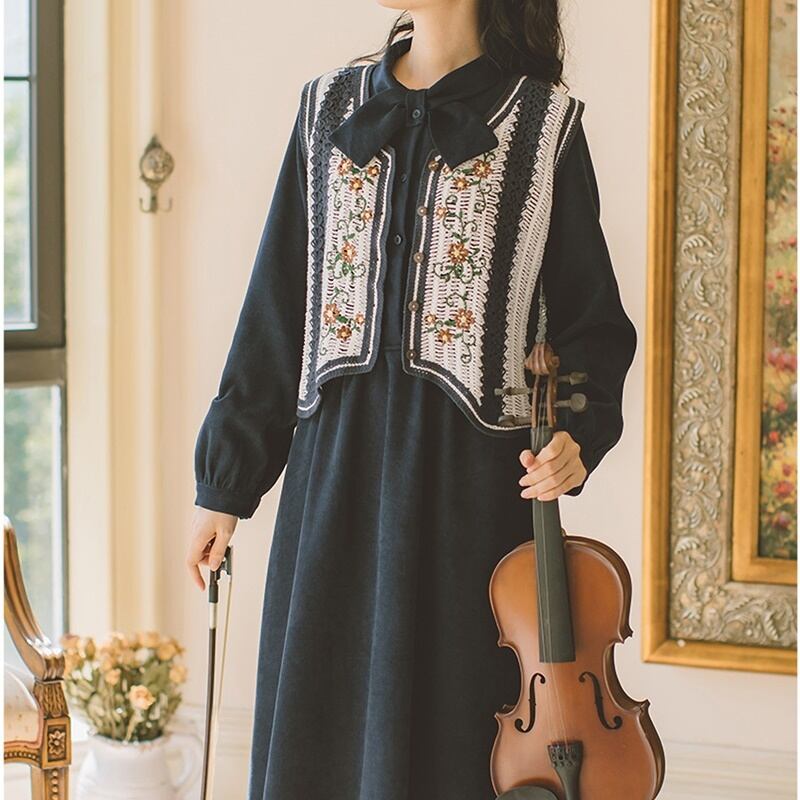 2カラー レトロ リボン Aライン 長袖 ワンピース *on747