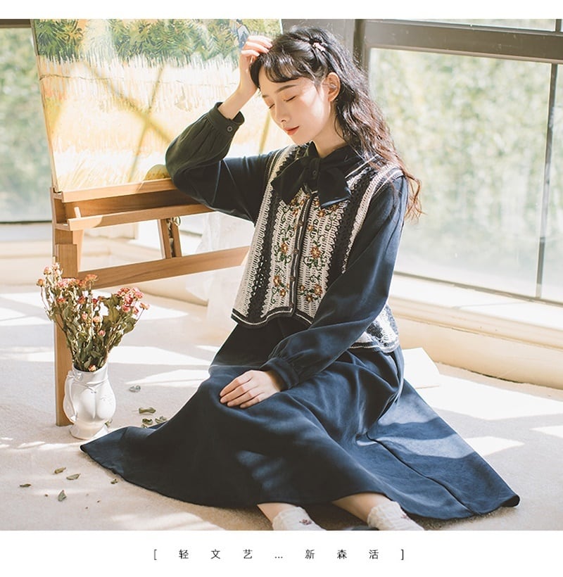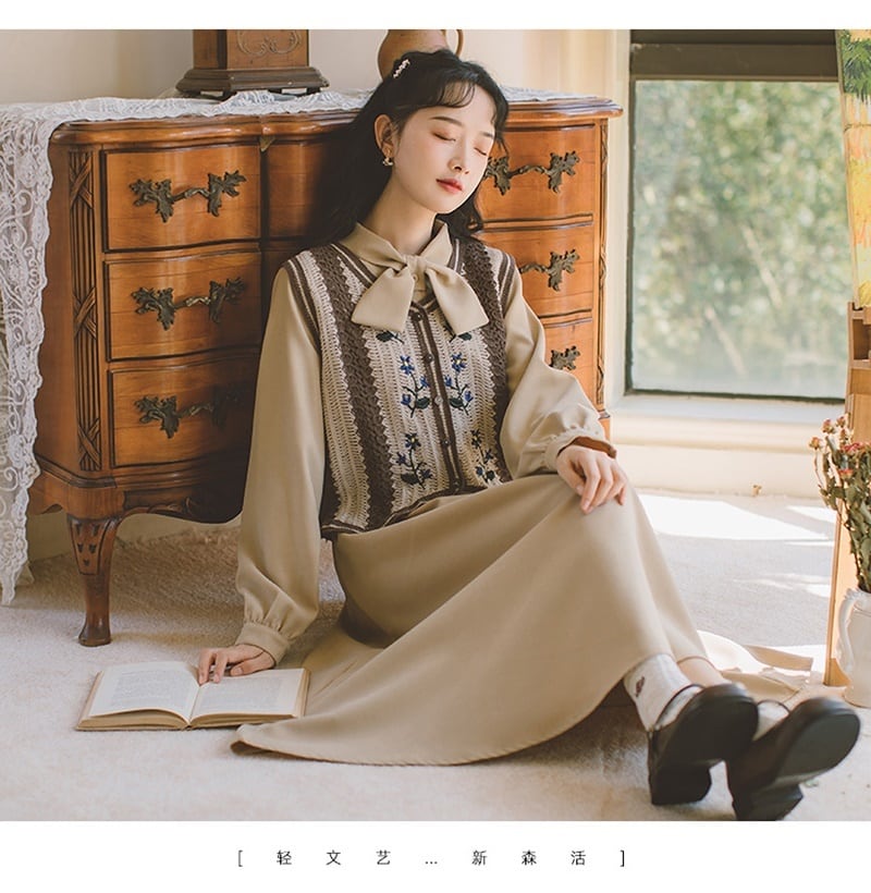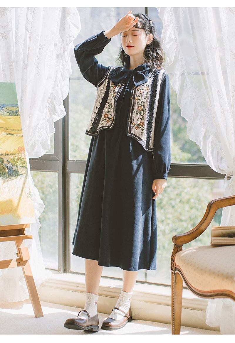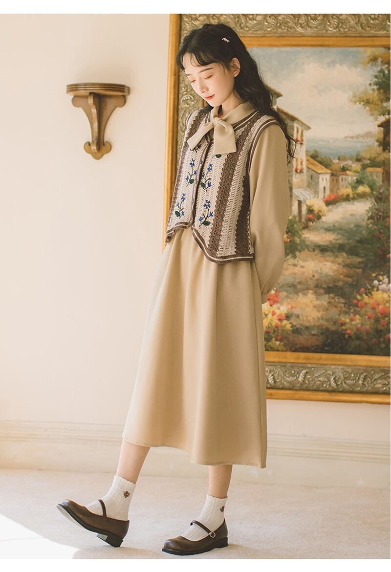 2カラー レトロ リボン Aライン 長袖 ワンピース *on747