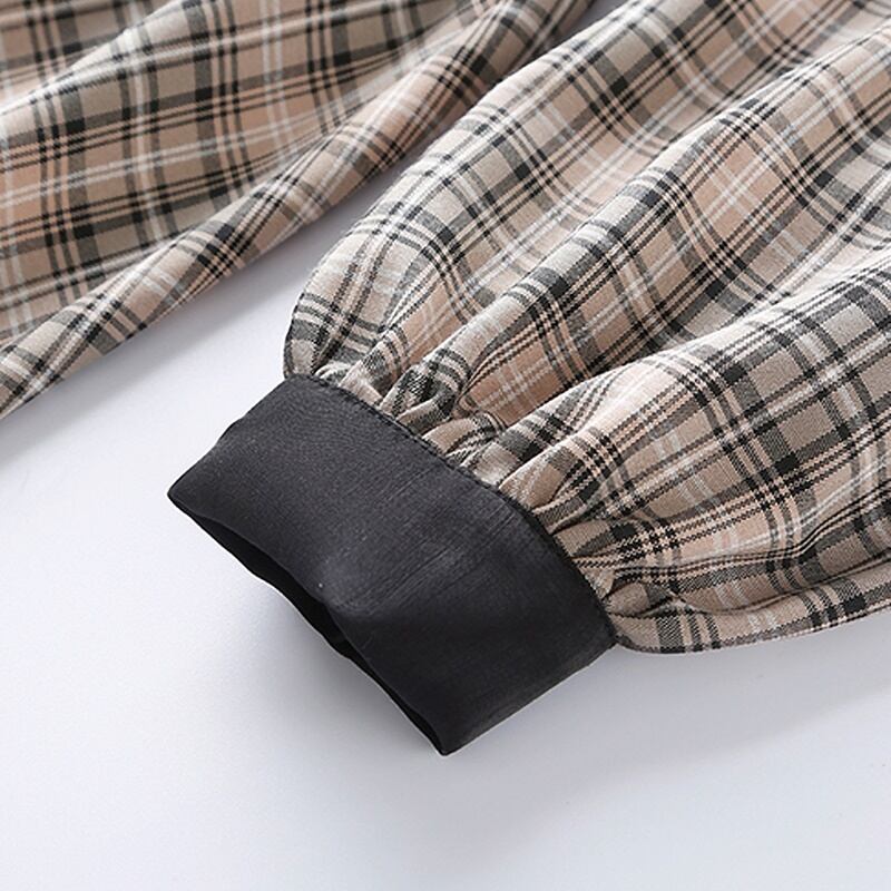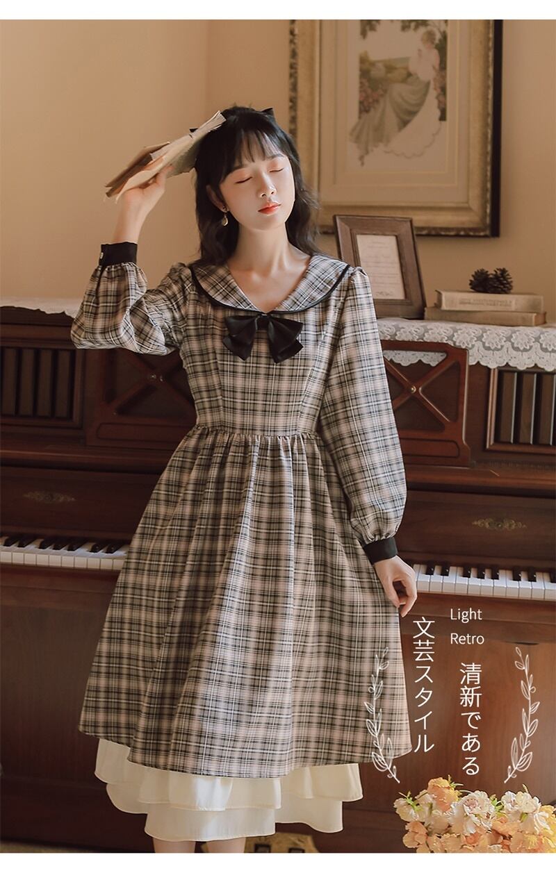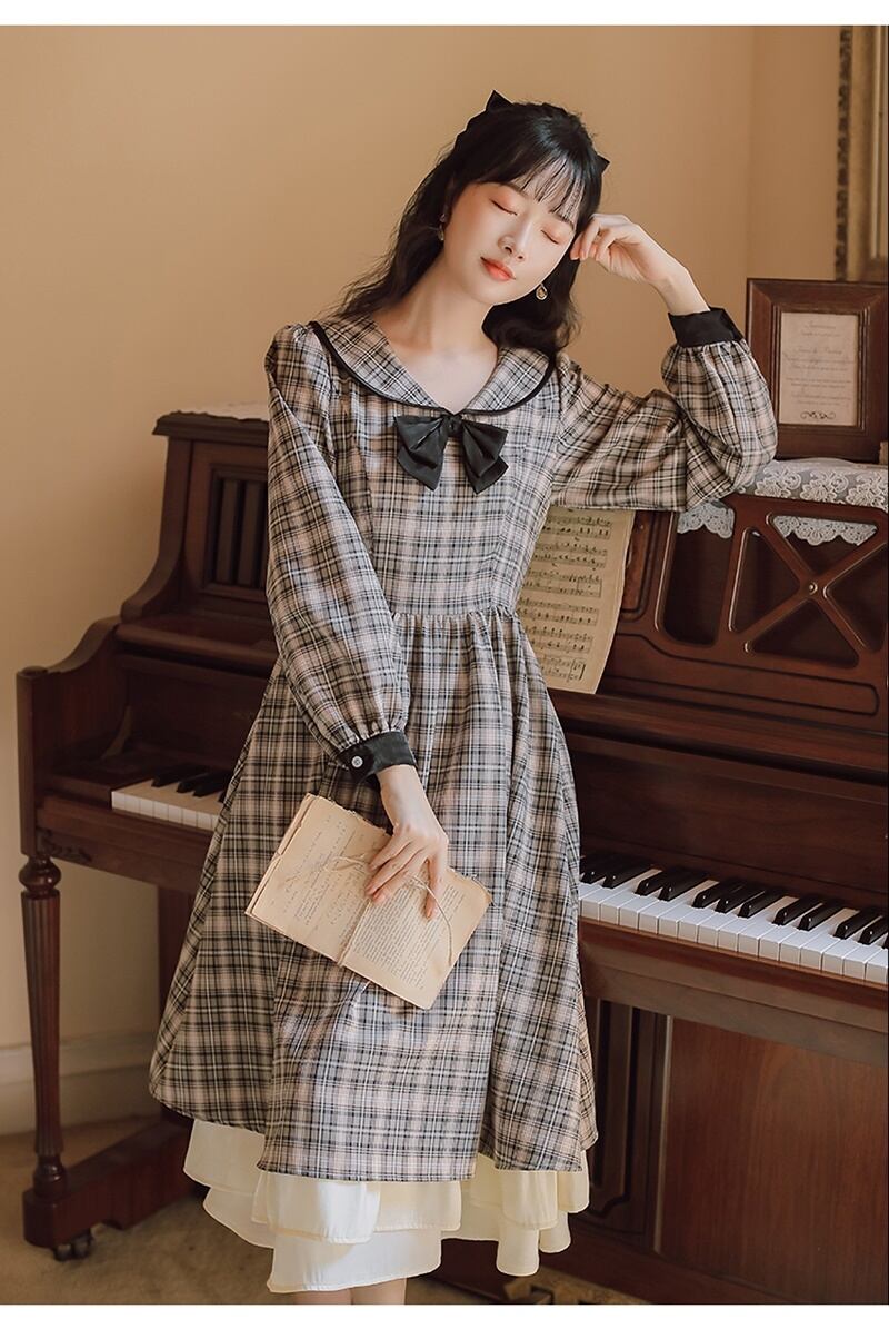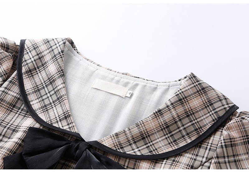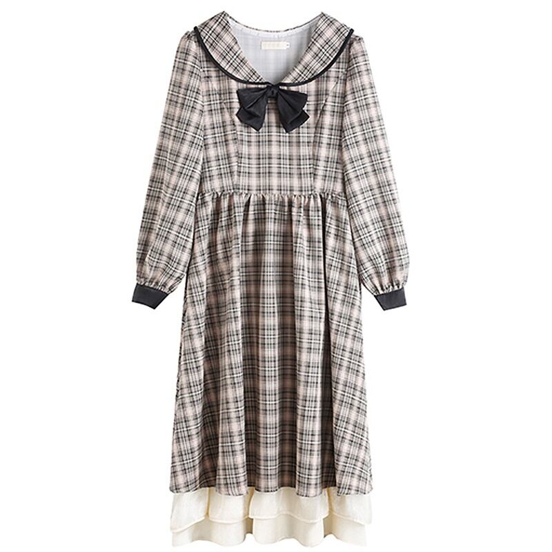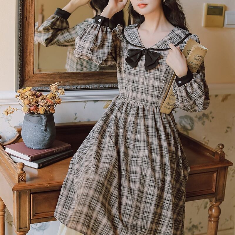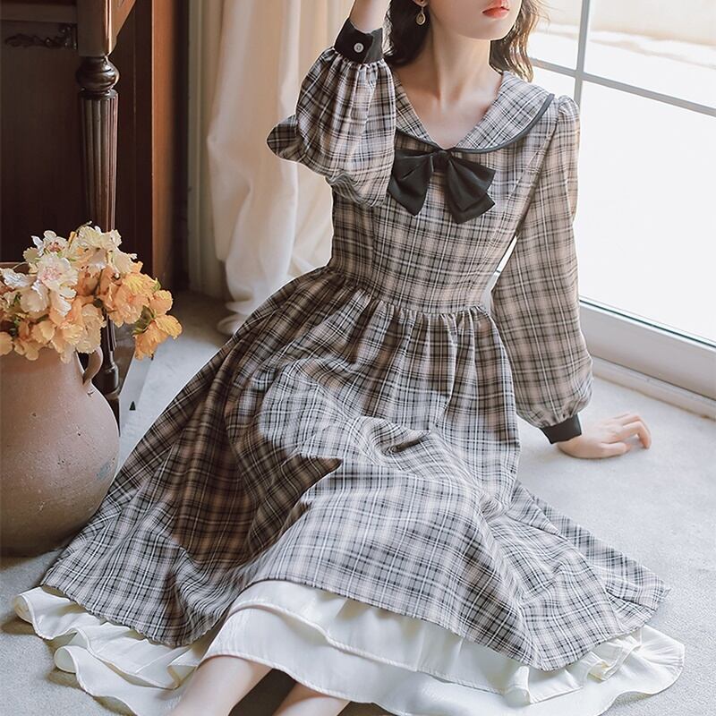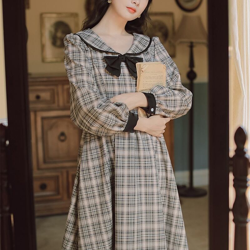 チェック柄 レトロ リボン Aライン 長袖 ワンピース *on749
