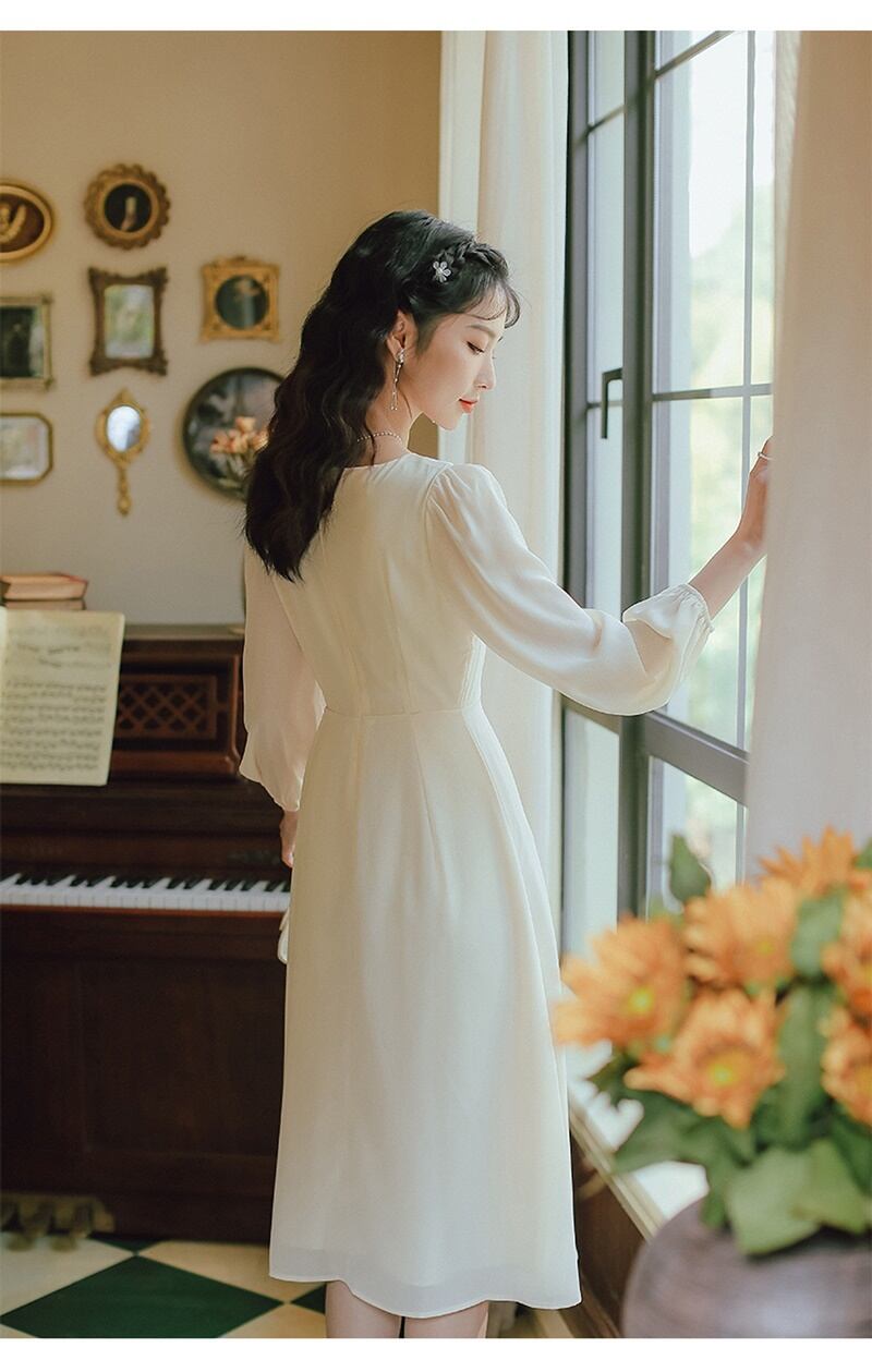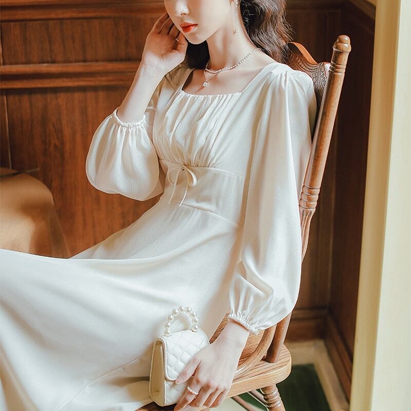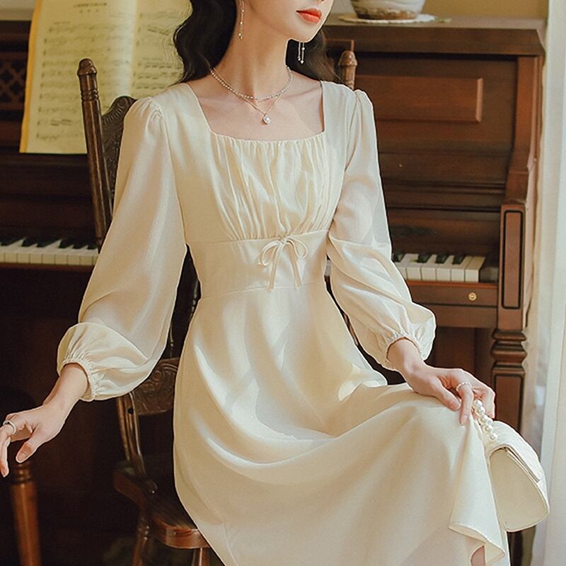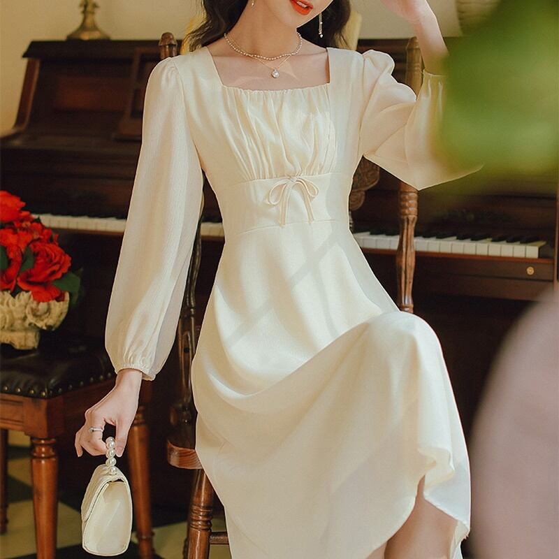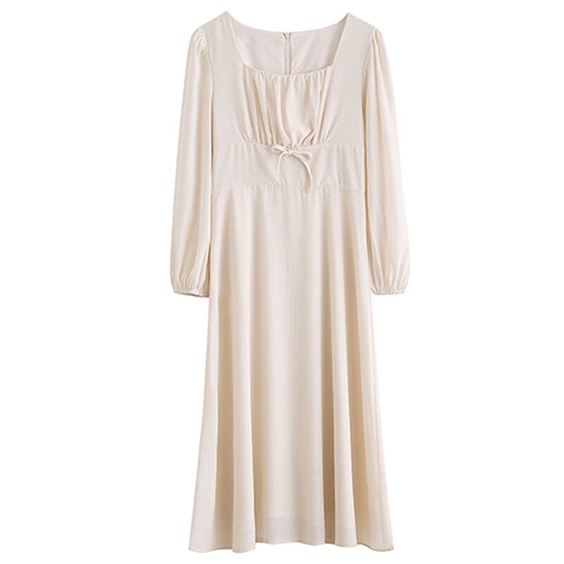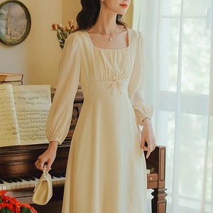 レトロ スクエアネック リボン Aライン 長袖 ワンピース *on751