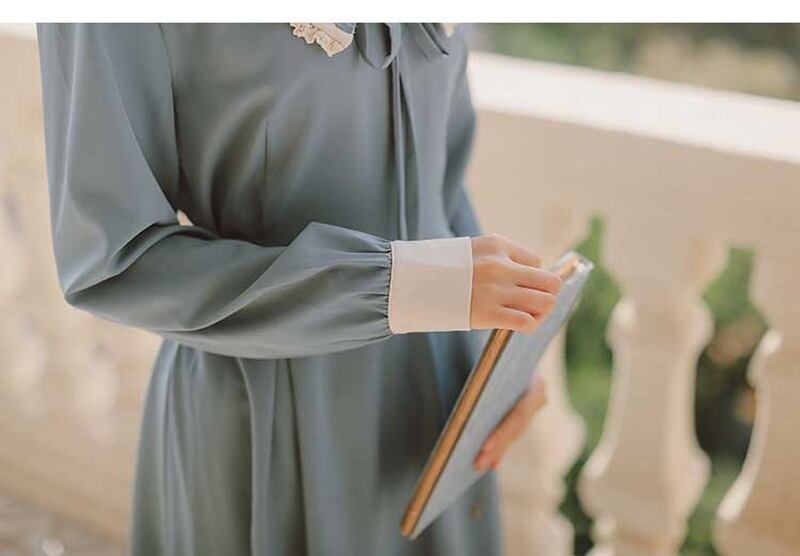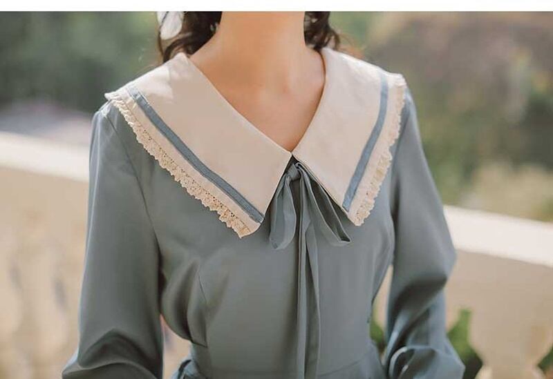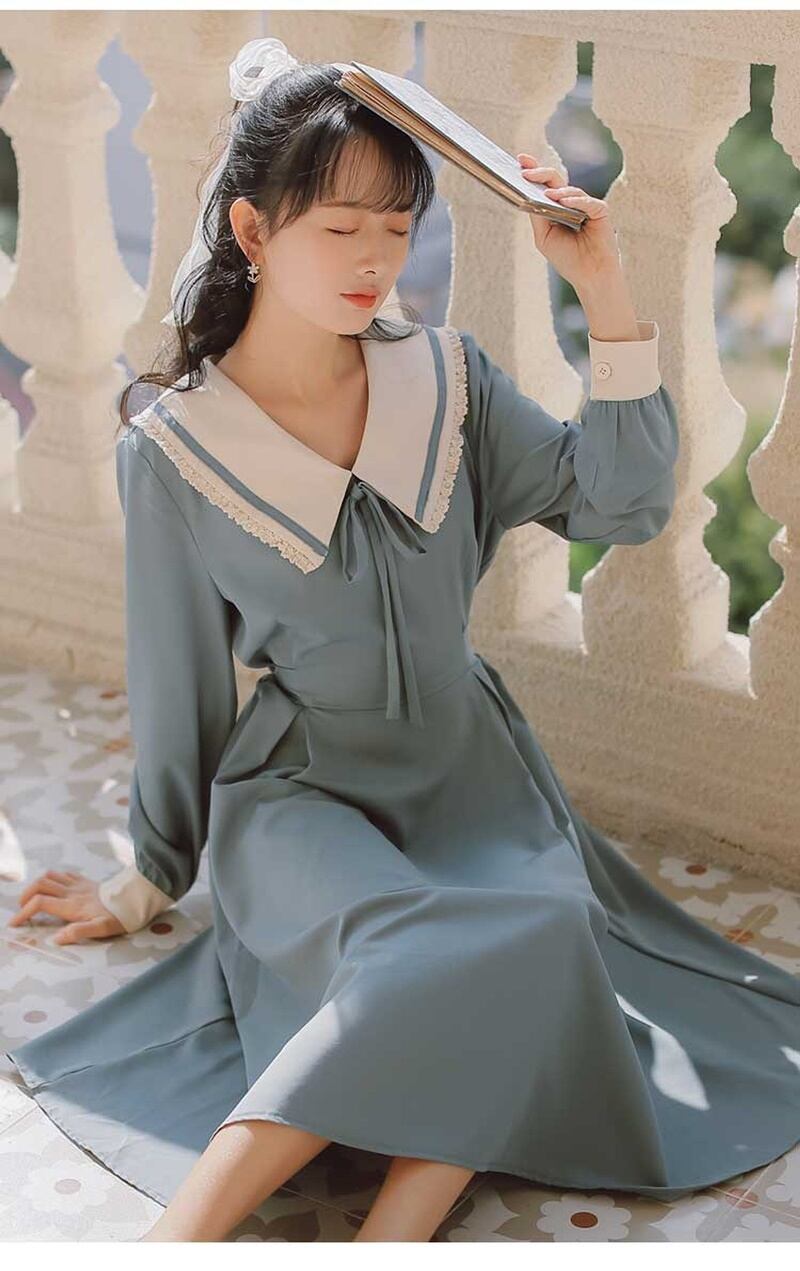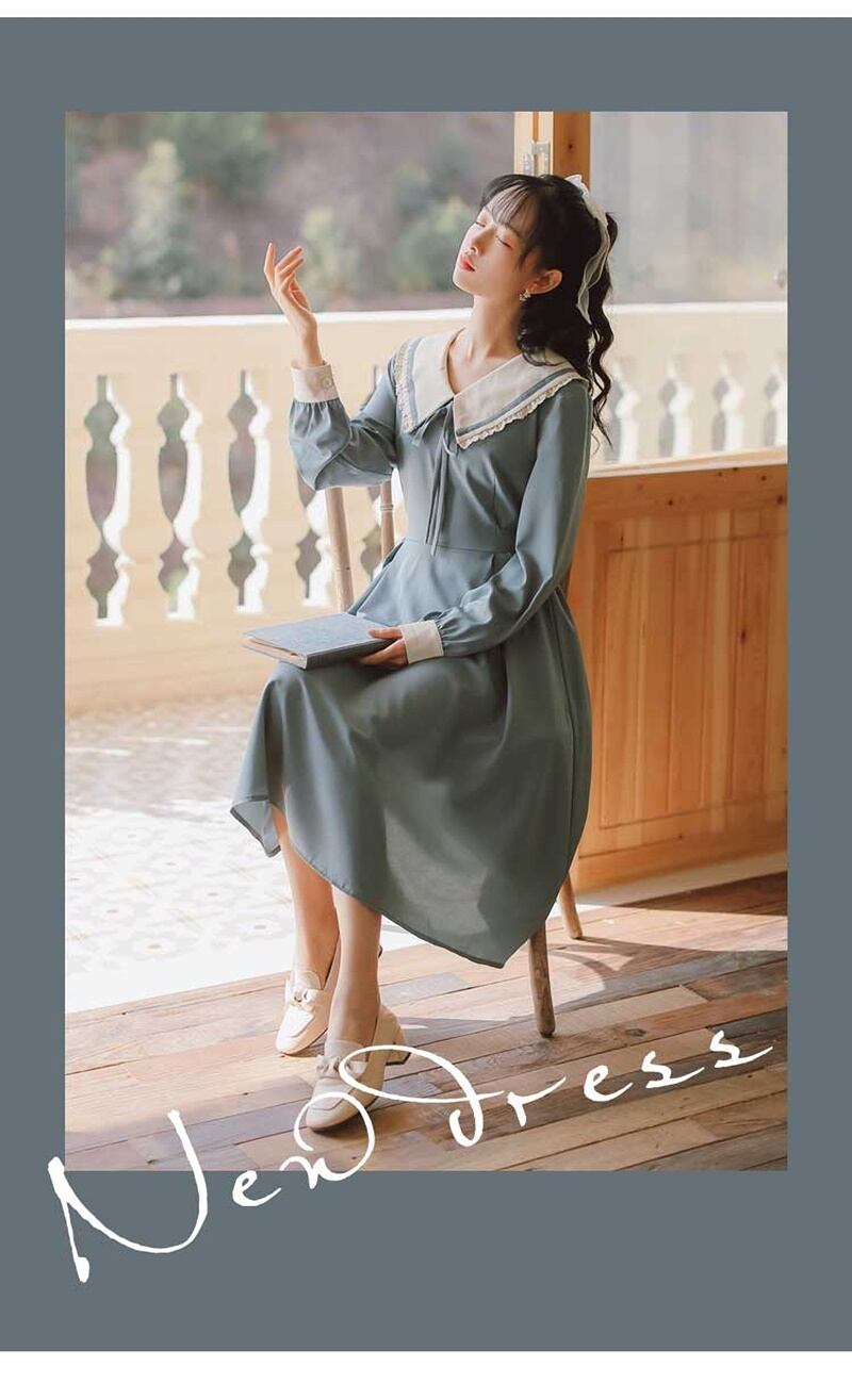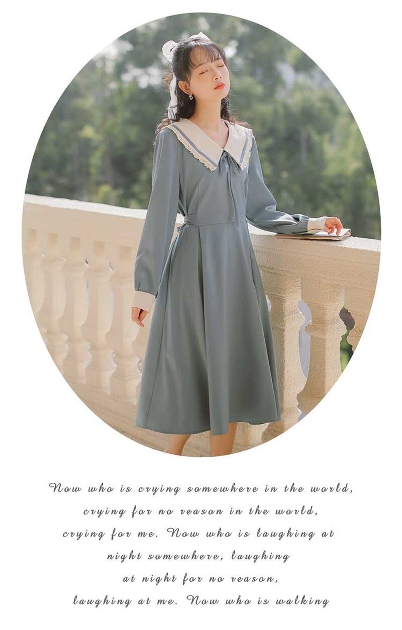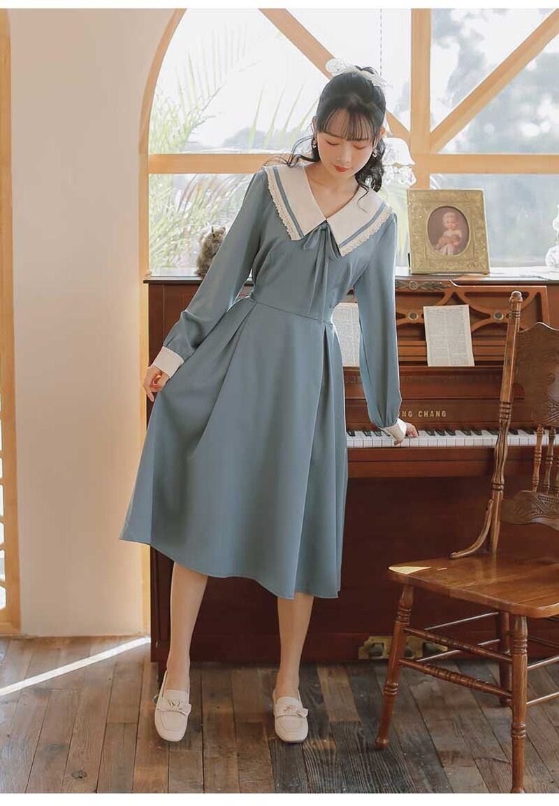 レトロ スクエアネック リボン Aライン 長袖 ワンピース *on752
