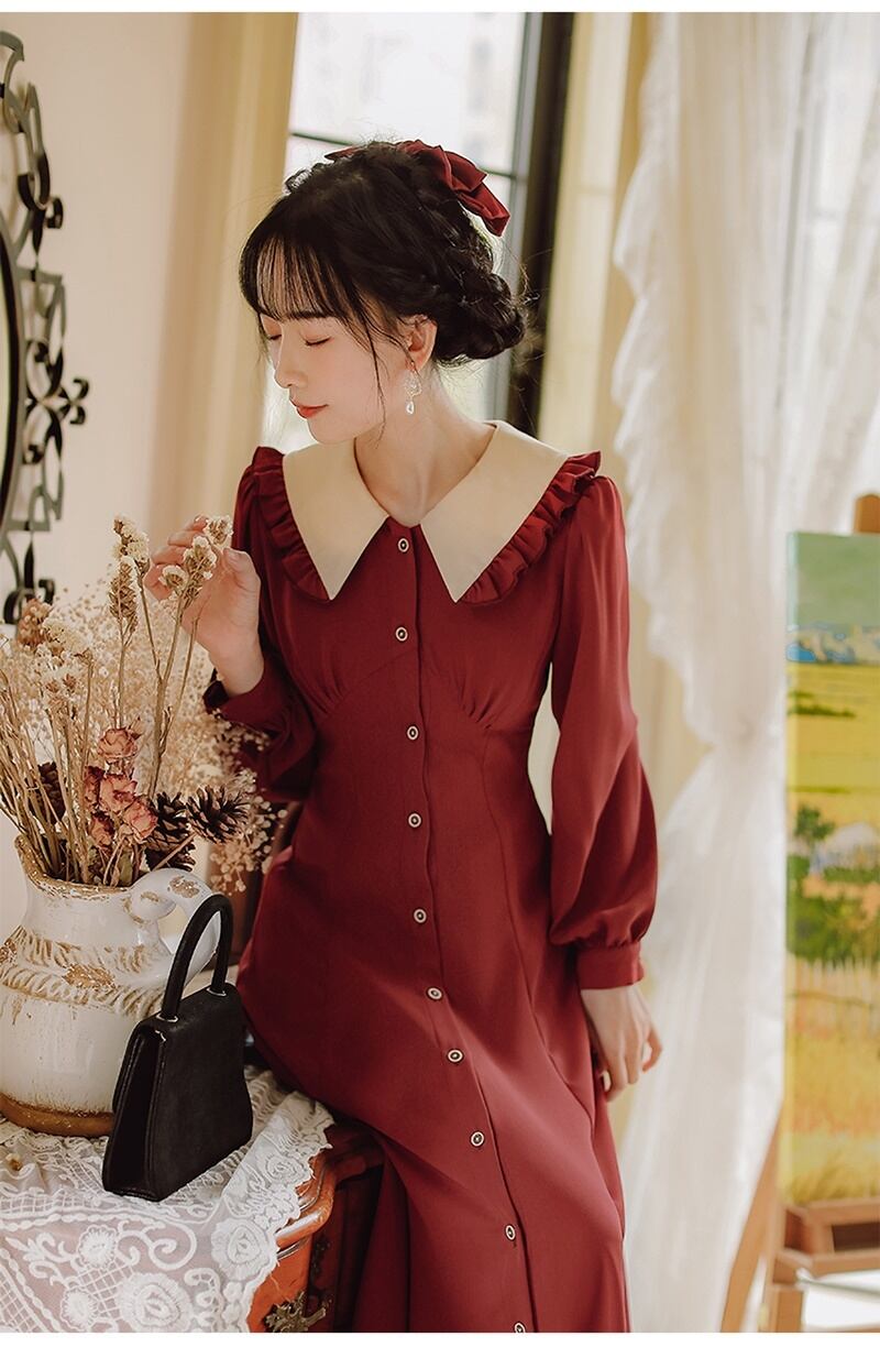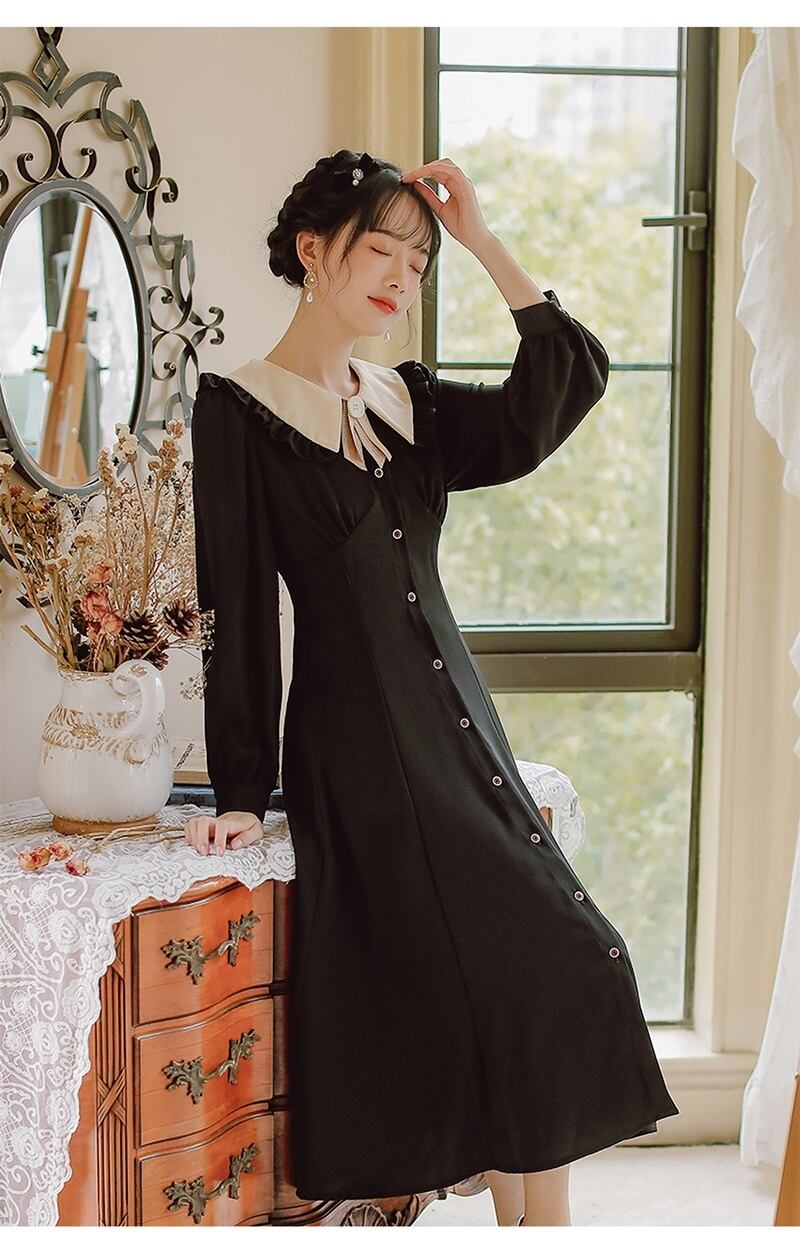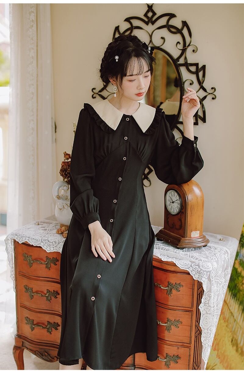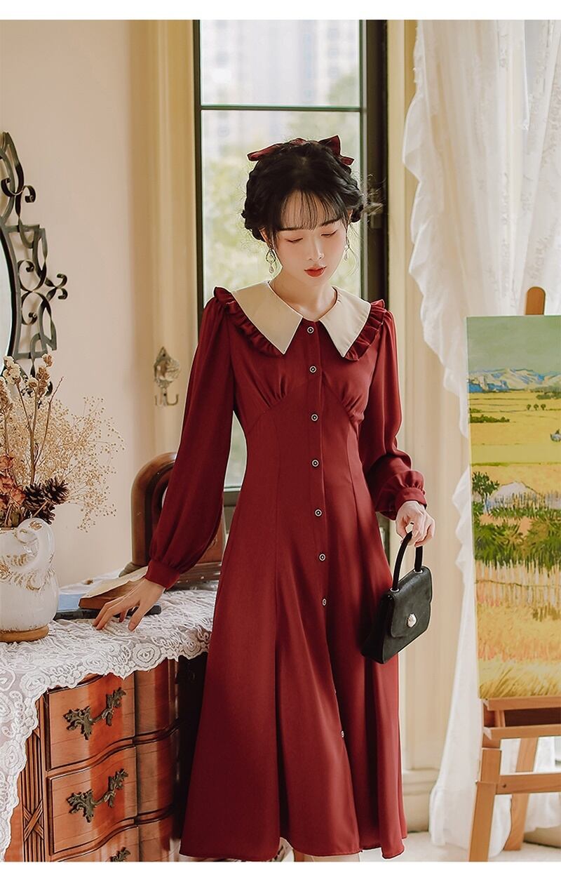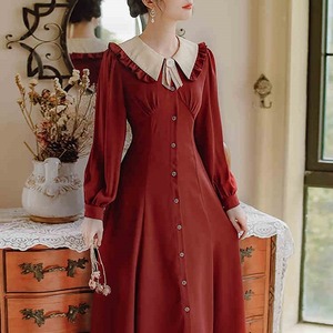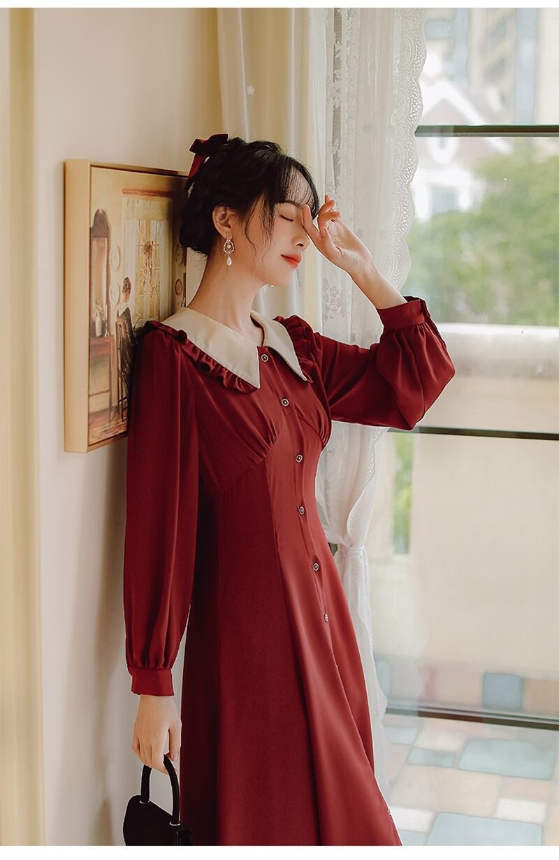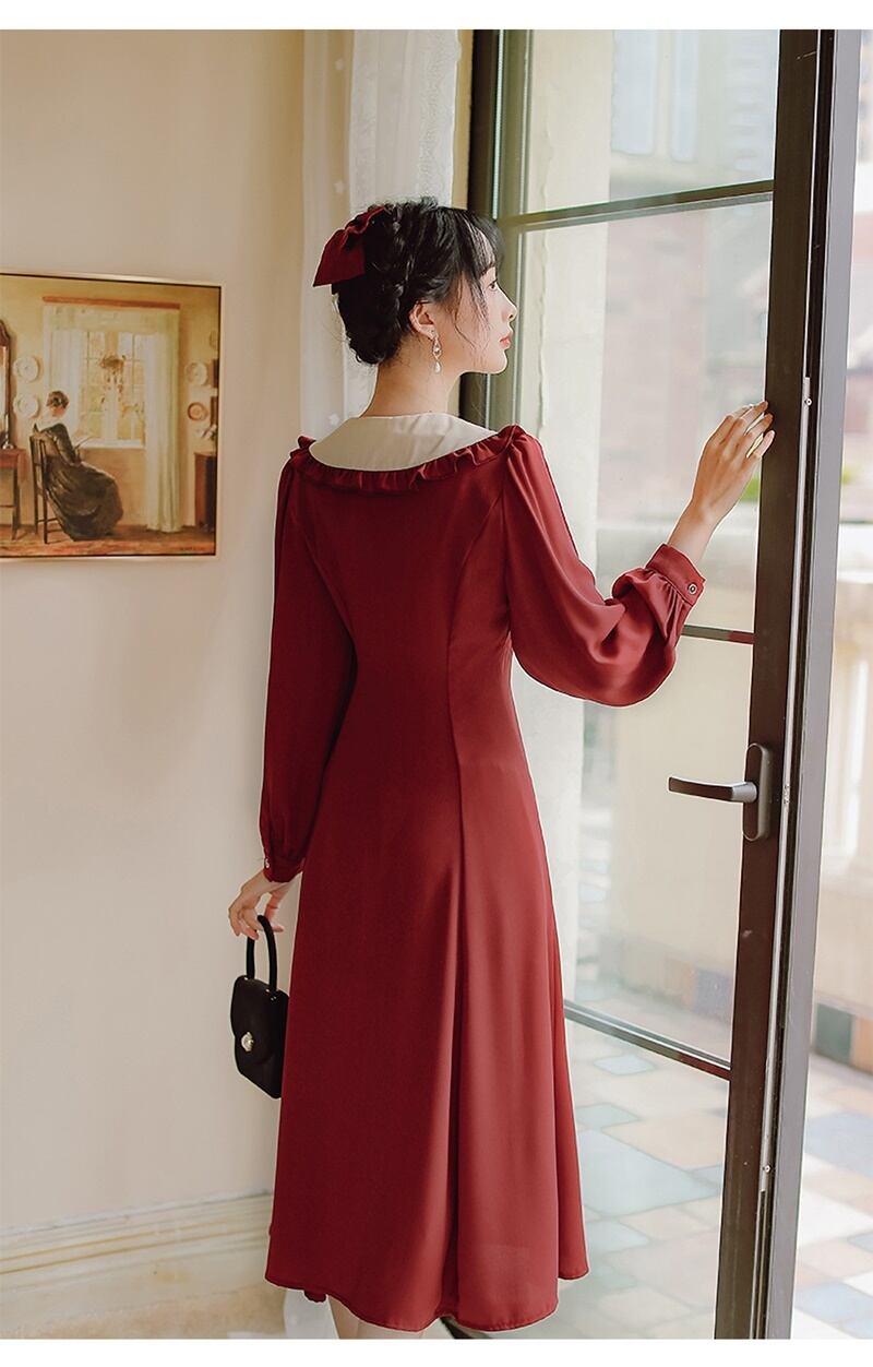 2カラー レトロ フリル襟 Vネック 長袖 ワンピース *on753