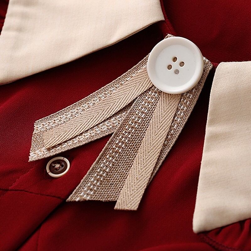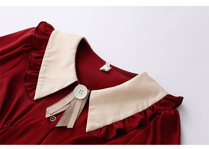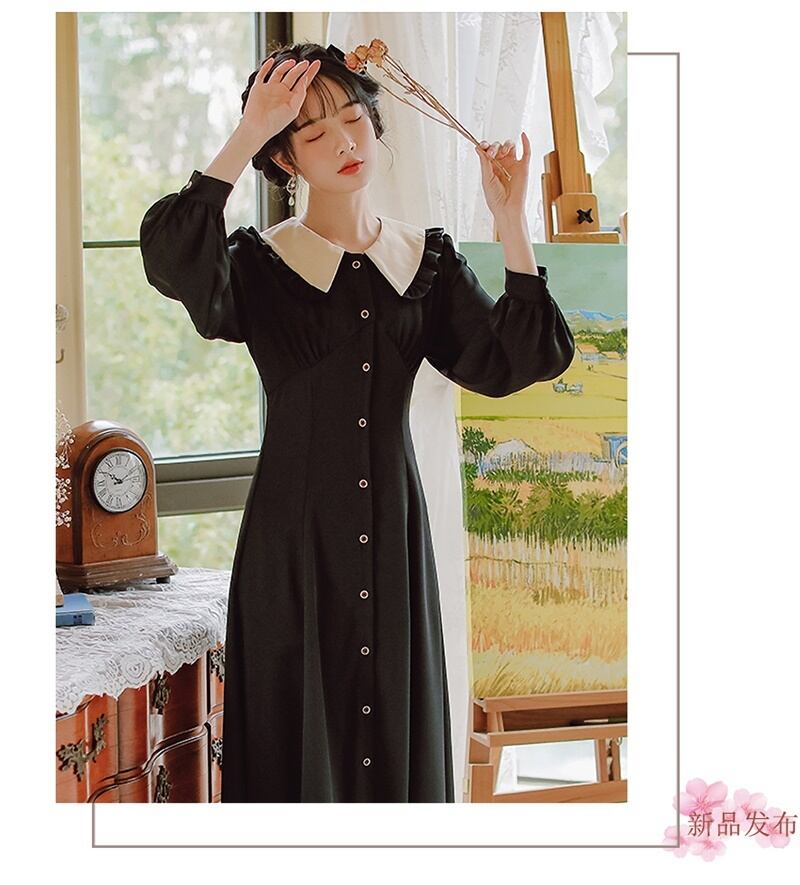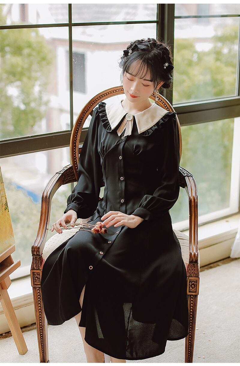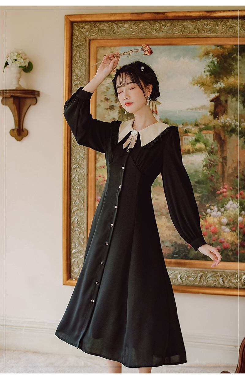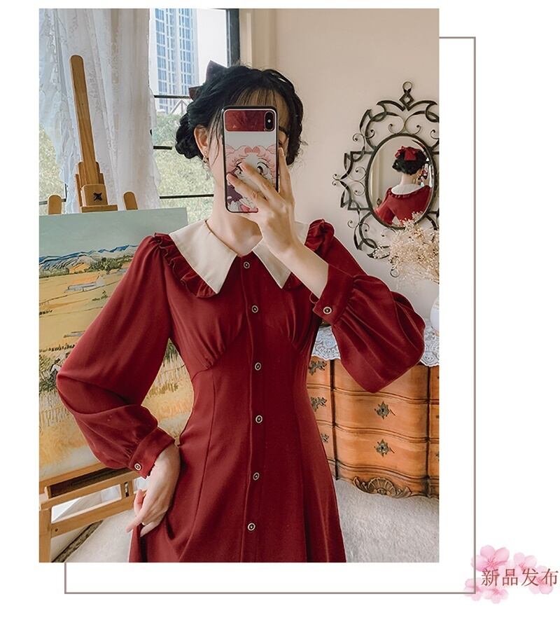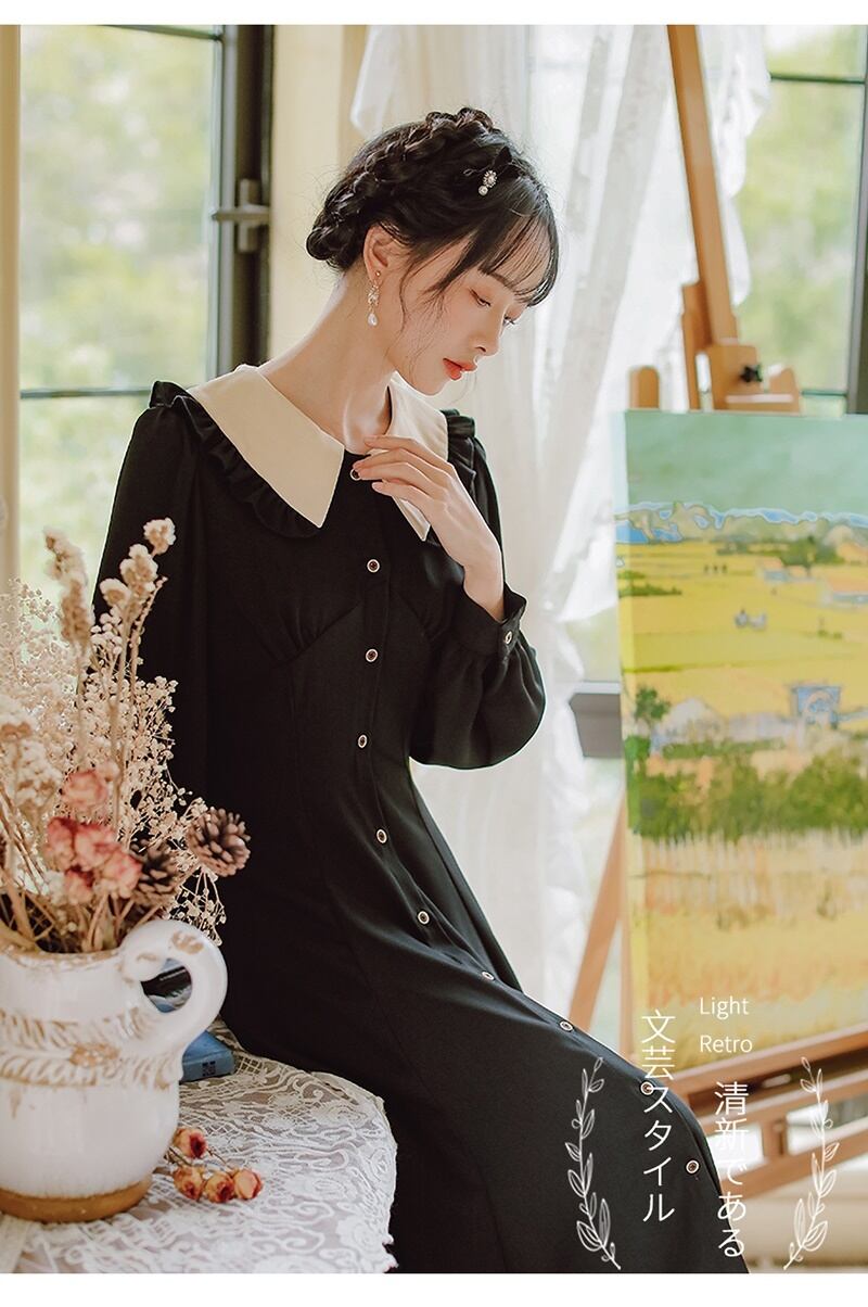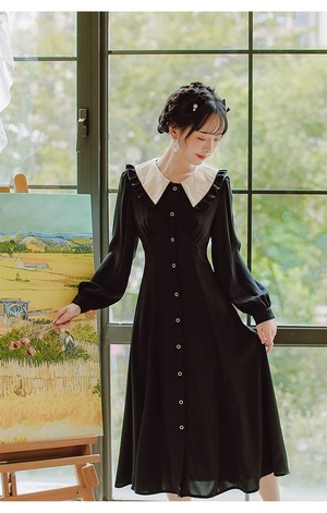 2カラー レトロ フリル襟 Vネック 長袖 ワンピース *on753