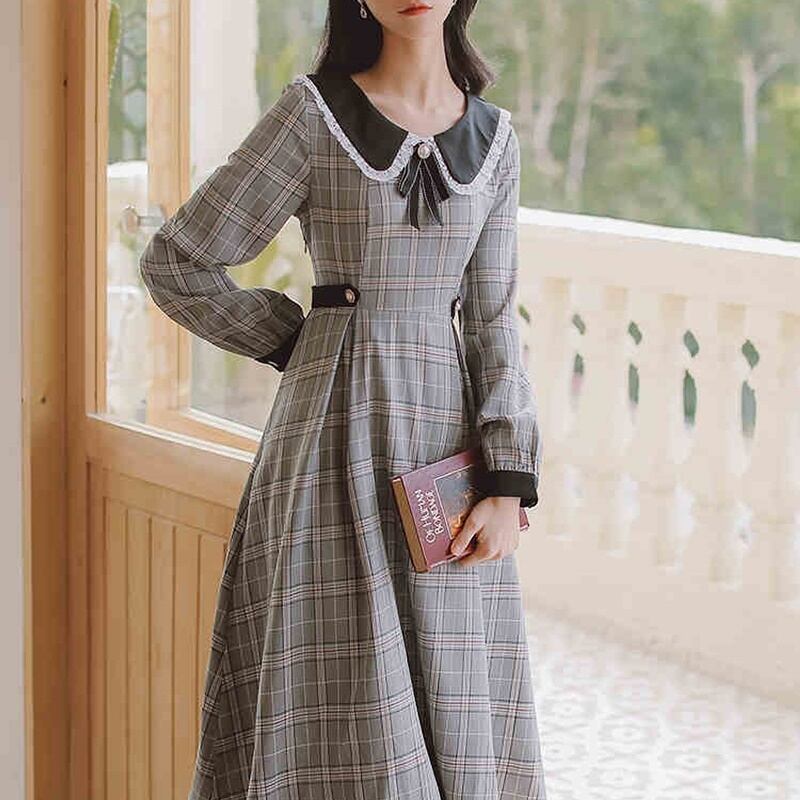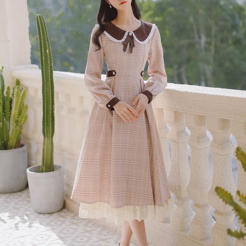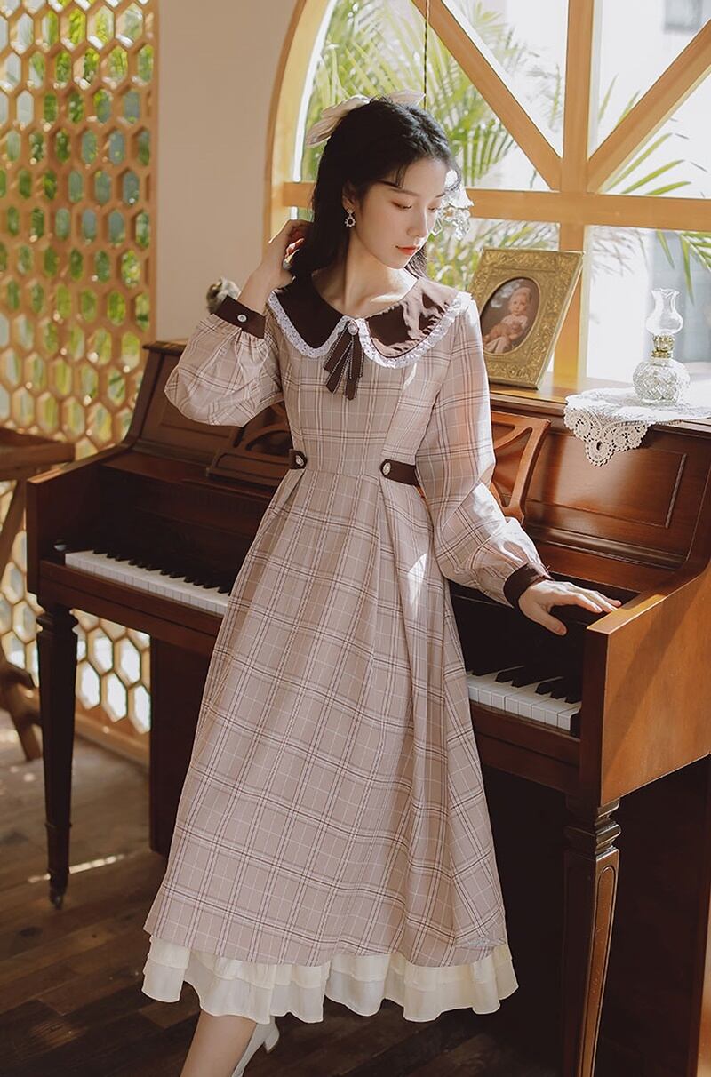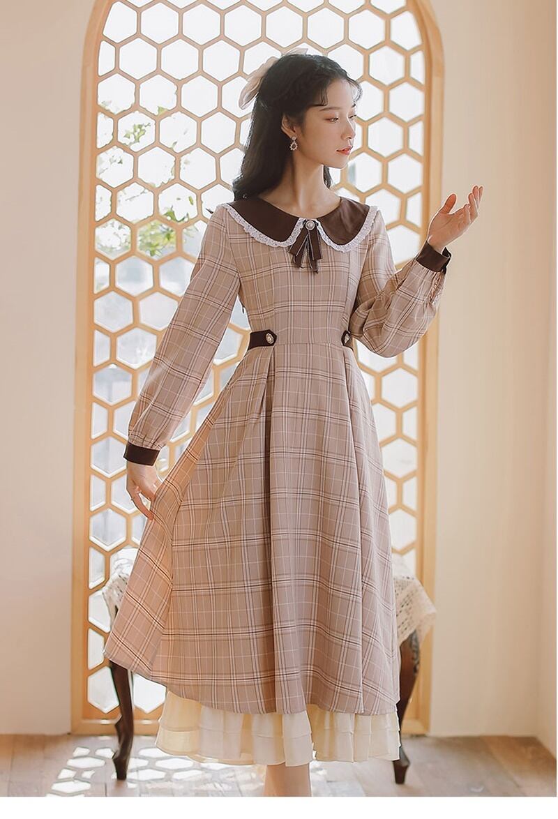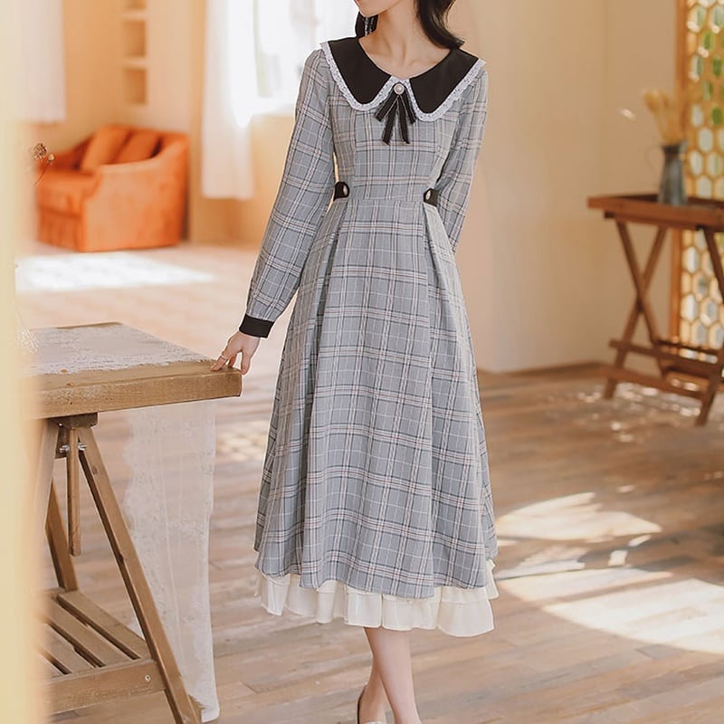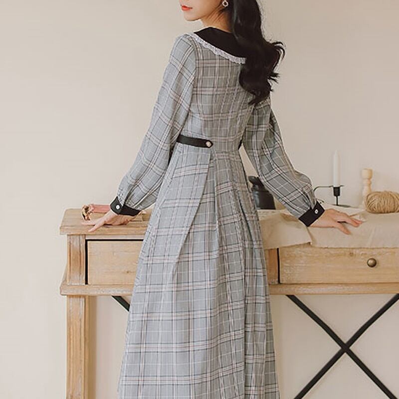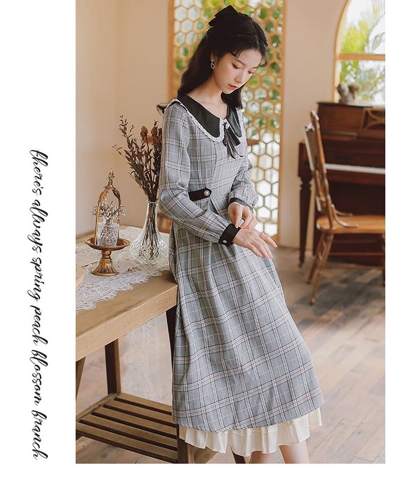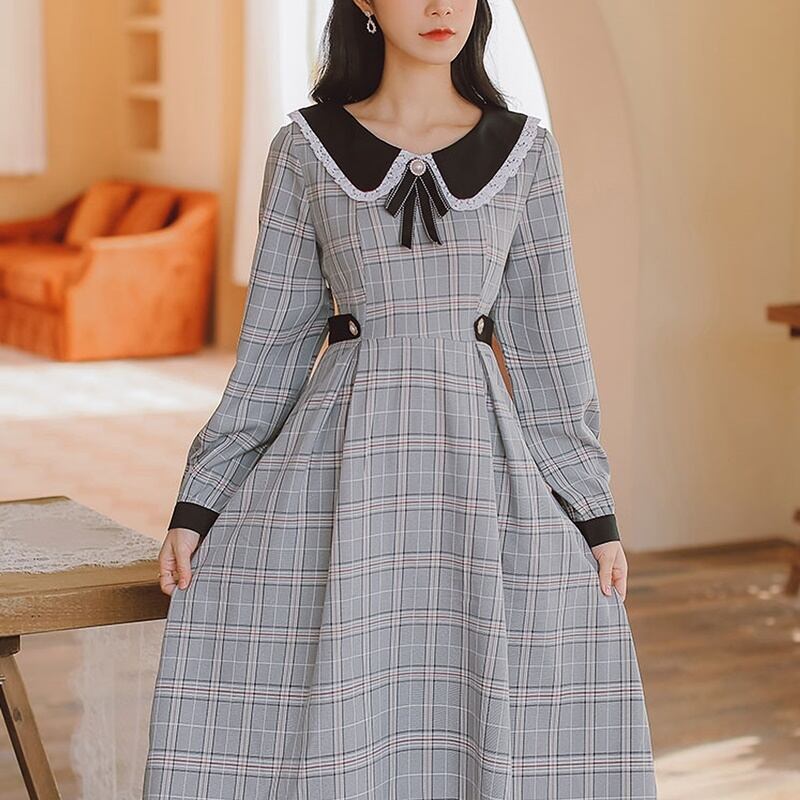 2カラー レトロ チェック柄 ラウンドネック 長袖 ワンピース *on754