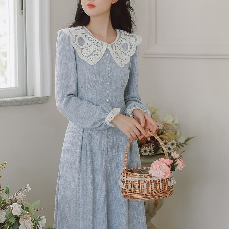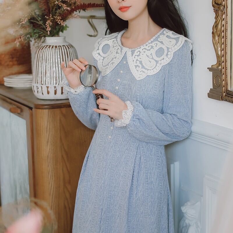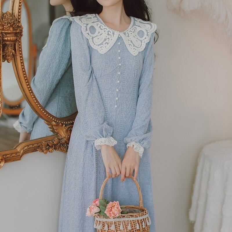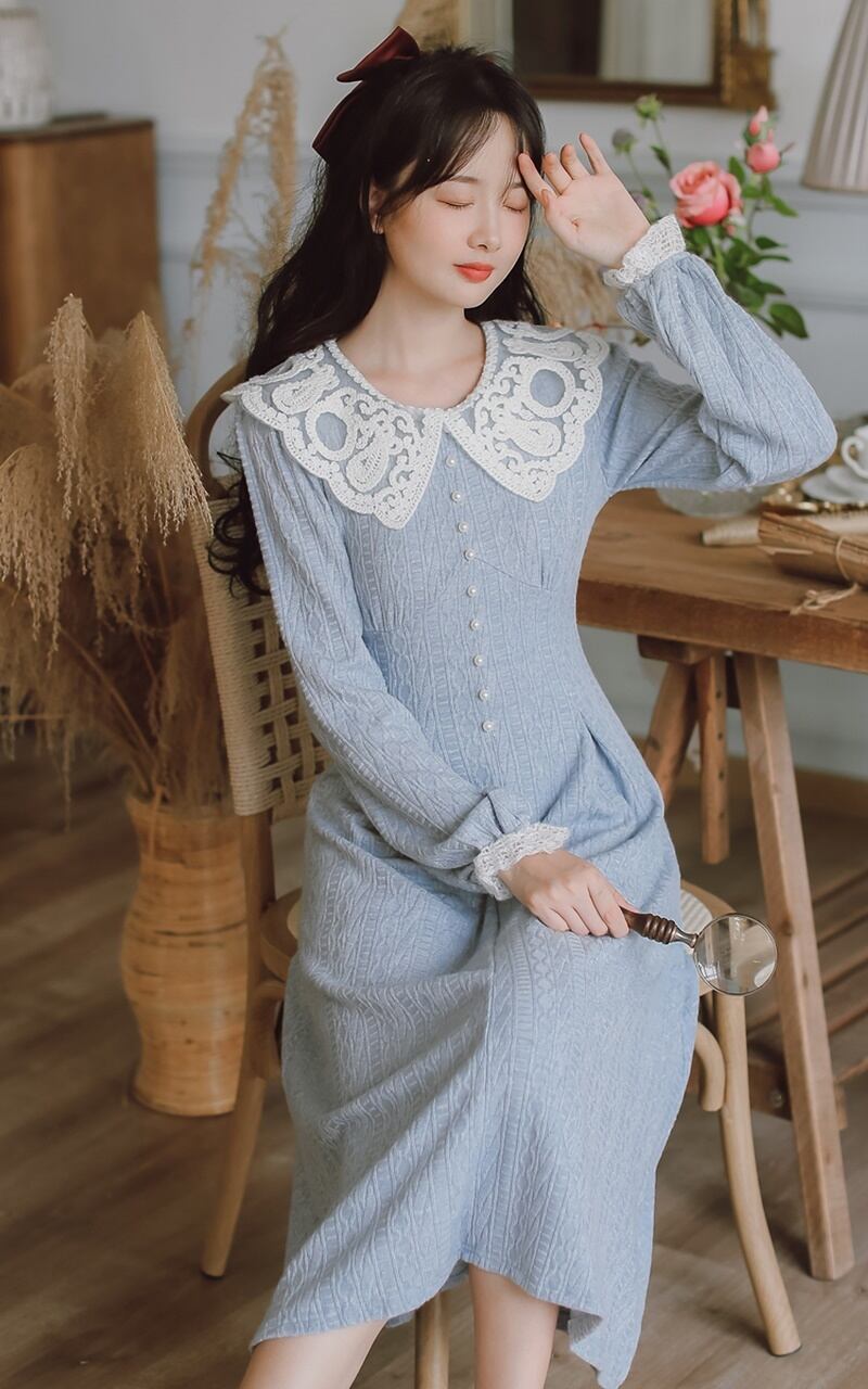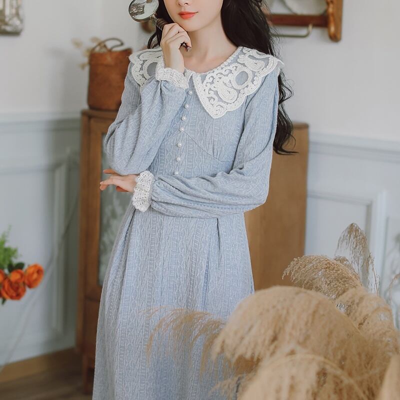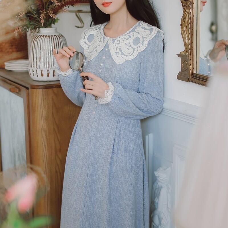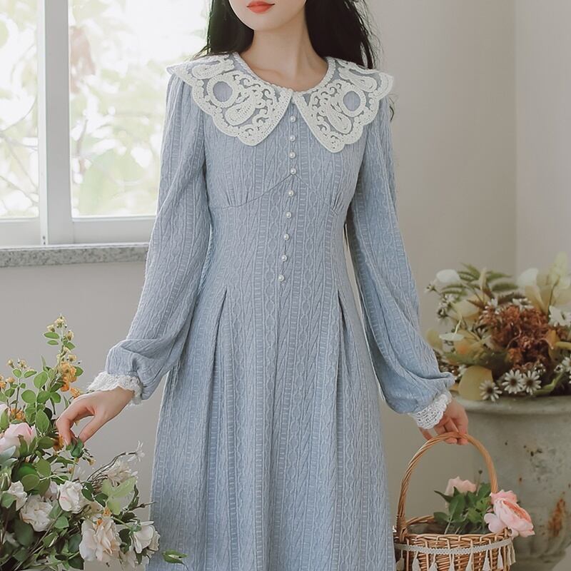 レトロ ラウンドネック レース Aライン 長袖 ワンピース *on755
