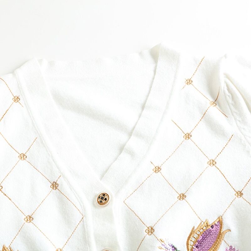 2カラー チェック柄 刺繍 長袖 ニット カーディガン *ca082