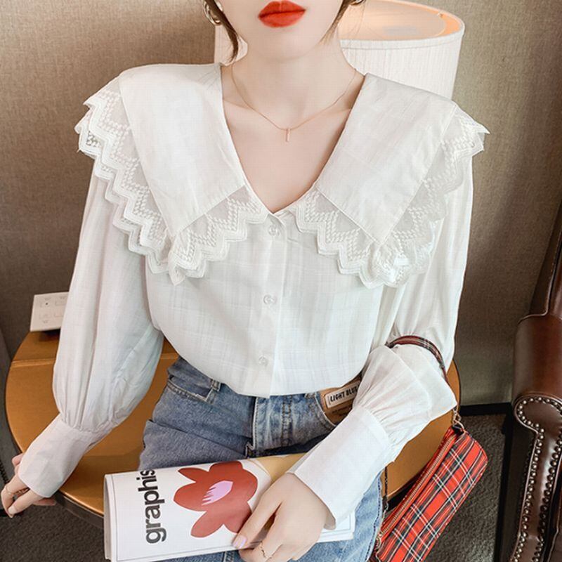 レース襟 ビッグカラー Vネック 長袖 シャツ ブラウス *bl378
