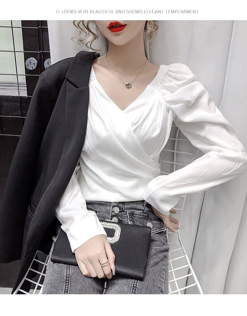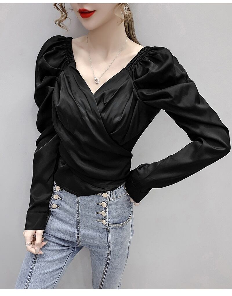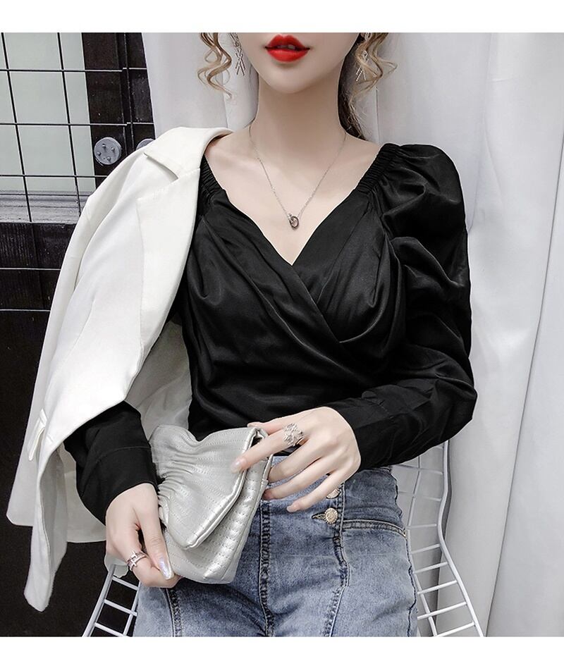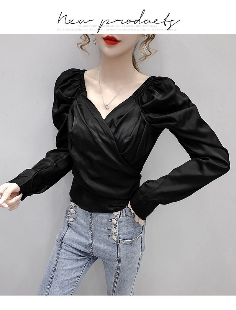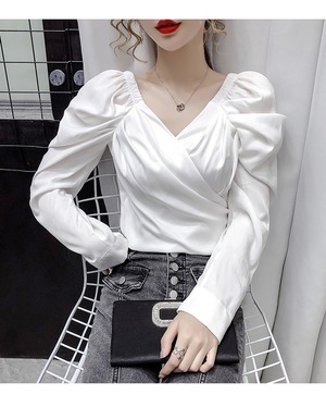 2カラー ギャザー Vネック 長袖 シャツ ブラウス *bl384
